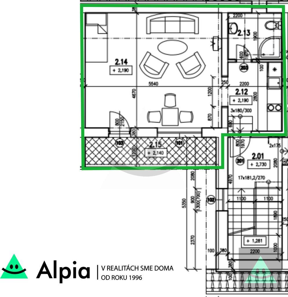 - Izba s kuchynským kútom: 25,87 m2 s južne orientovanou loggiou o výmere 6,4 m2