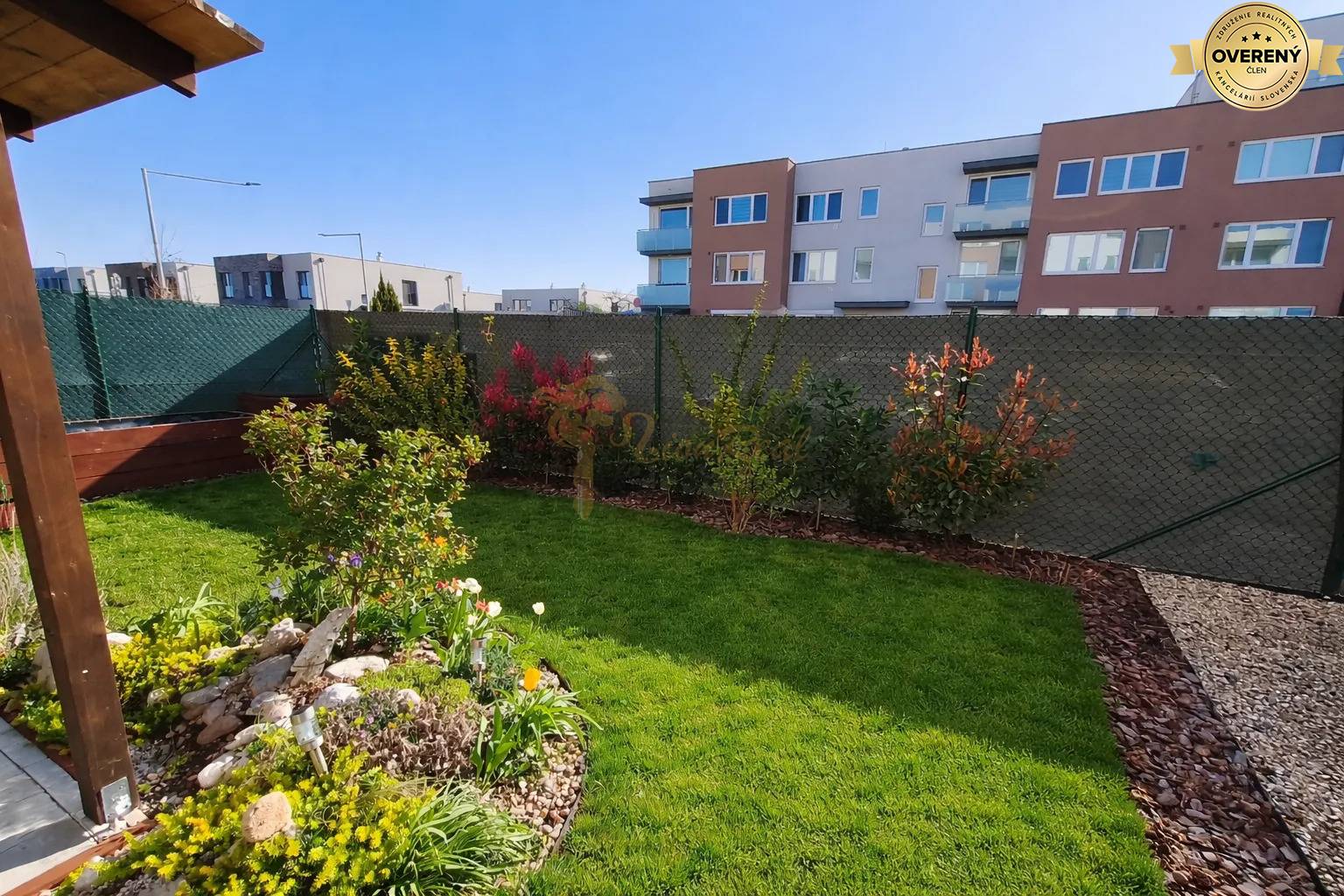 Výmera terasy je 9 m² a veľkou výhodou je, že je prekrytá solídnym dreveným prístreškom zapusteným do steny. Záhrada má predpripravené miesto pre záhradný domček a vírivku/saunu. Súčasťou je aj vyvýšený záhon, živý plot a skalka.