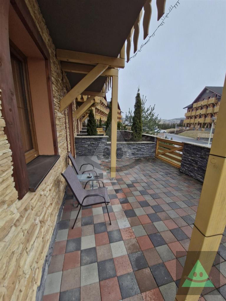Byt sa nachádza na prízemí a je plne zariadený, pripravený na okamžité využitie bez ďalších investícií. Veľkým benefitom je priestranná terasa, ktorá ponúka ideálny priestor na oddych s výhľadom na Vysoké Tatry.