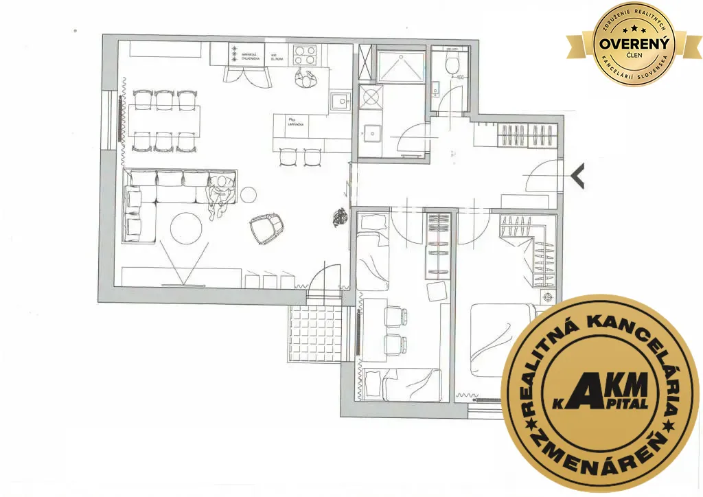 • Dispozícia: 3-izbový byt (obývacia izba prepojená s kuchyňou, 2 samostatné izby, predsieň, kúpeľňa, samostatné WC).