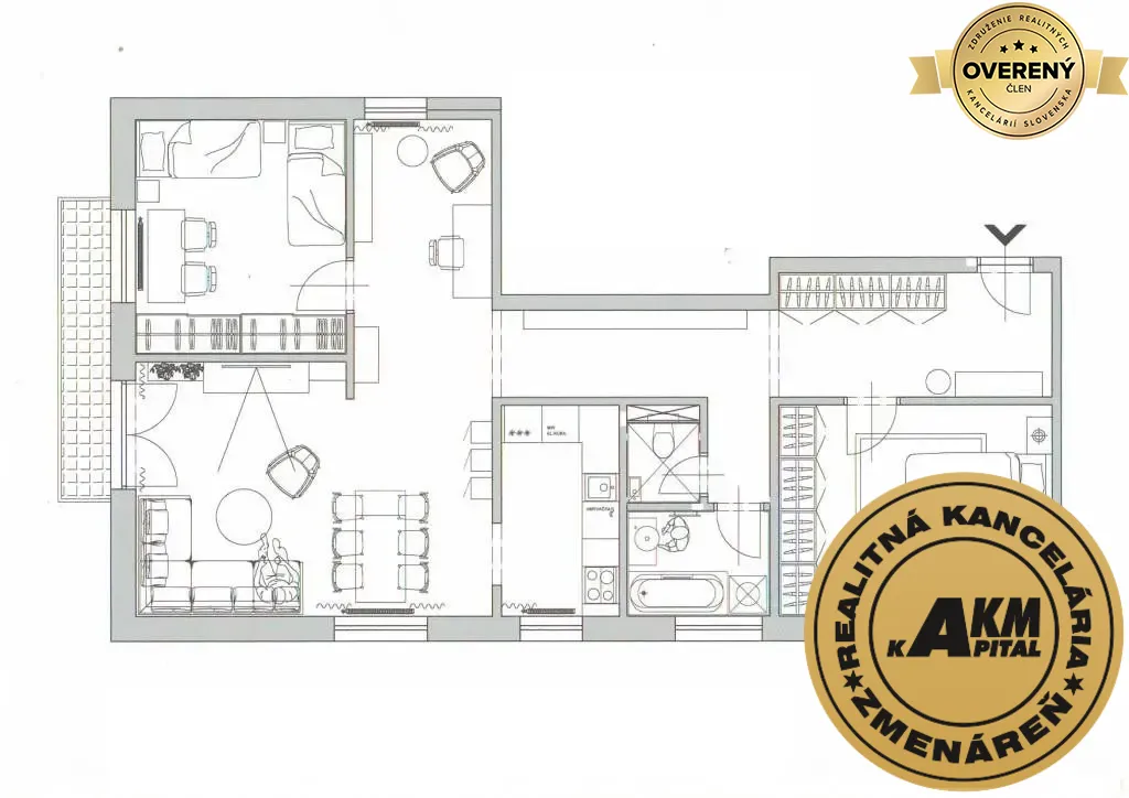 • Dispozícia: 3-izbový byt (kuchyňa, obývacia izba, 2 samostatné izby, predsieň, kúpeľňa, samostatné WC).