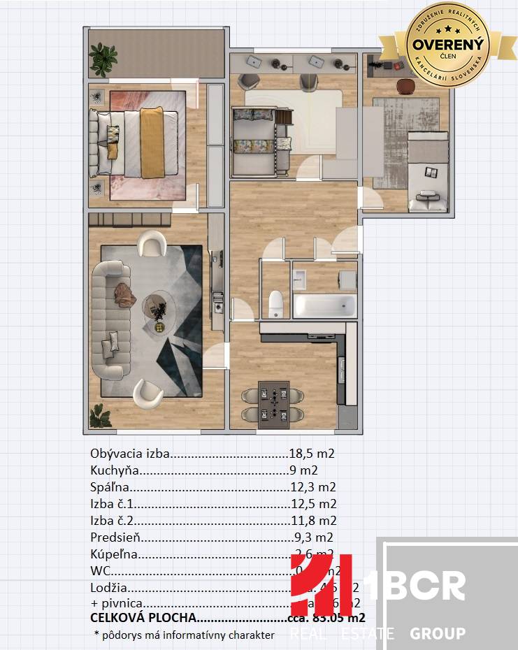 © Text a pôdorys je autorským dielom a majetkom 1.BCR GROUP. Všetky prezentované údaje zverejnené v tomto inzeráte majú informatívny charakter a žiadnej strane nevzniká nárok na uzatvorenie zmluvy. Pôdorys je informačný. Spoločnosť 1.BCR s.r.o. nenesie za ich správnosť, úplnosť a presnosť žiadnu zodpovednosť.
