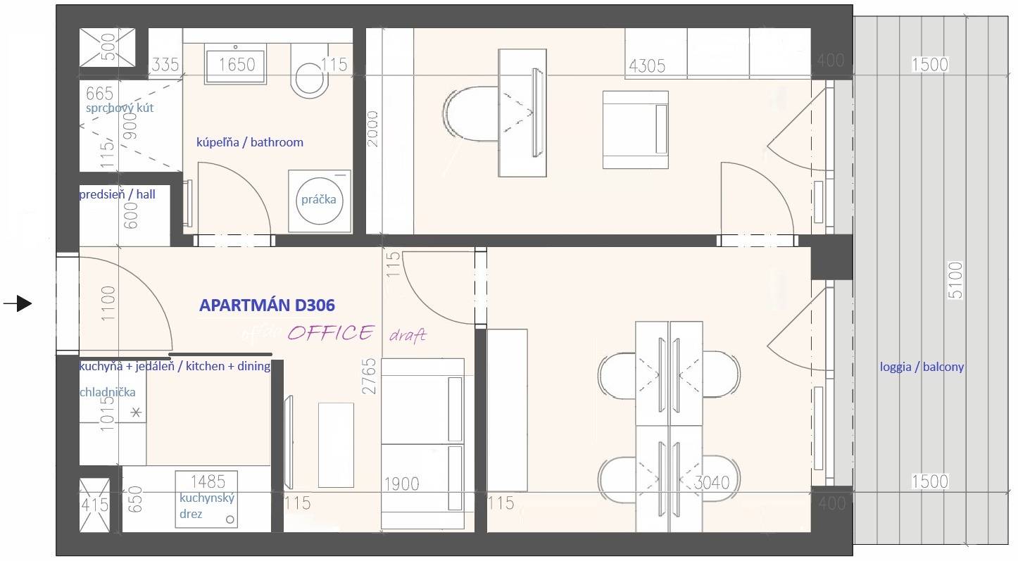Veľmi svetlý apartmán s priestranným exteriérom je tvorený predsieňou s úložným priestorom. Zázemie dotvárajú kúpeľňa so sprchovým kútom a priestorom na práčku, toaletou. Vstupná chodba plynule prechádza do dennej časti nebytového priestoru tvorenej priestorom pre kuchynku, ktorý nadväzuje na otvorený priestor, všetko s maximálnym komfortom a svetla. Samostatný priestor / kancelária s dostatkom úložného priestoru, s priestorom na veľký pracovný stôl ako aj príručný pracovný stolík a prípadne aj lôžko. Obe kancelárie majú výstup na hlbokú loggiu s výhľadom na komunitný bazén a do zelene – Národná prírodná rezervácia: Devínska Kobyla. Viď. návrh možnej úpravy pôdorysu.