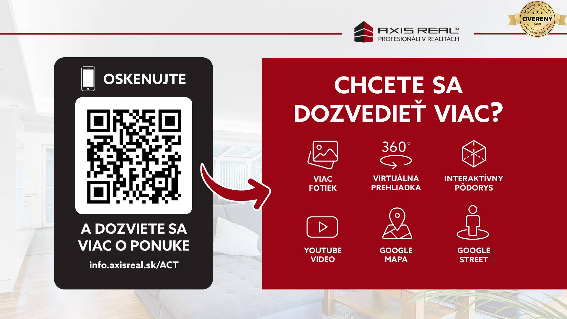 360° VIRTUÁLNU PREHLIADKU A 3D PÔDORYS NEHNUTEĽNOSTI NÁJDETE NA: https://info.axisreal.sk/ACT