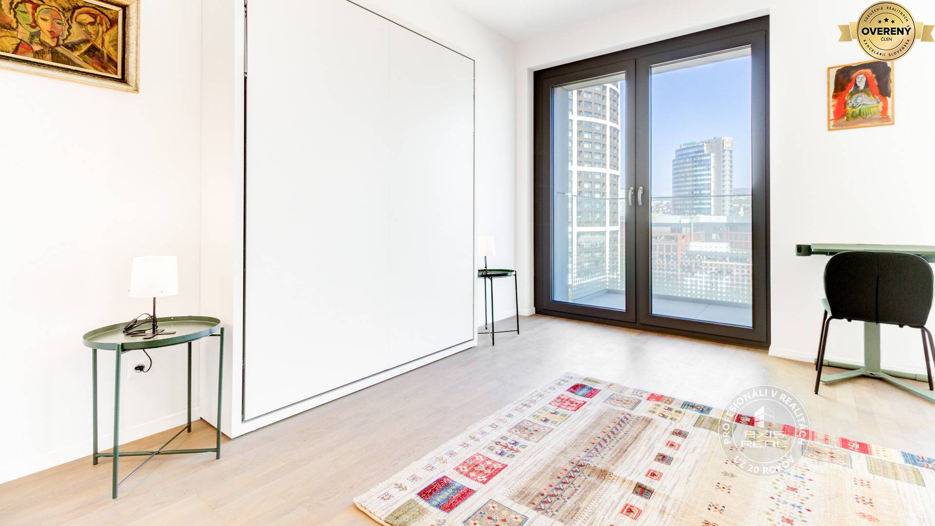 Realitná kancelária AXIS REAL ponúka na prenájom NOVÝ, NÁDHERNÝ 1-izbový byt s DVOMI BALKÓNMI a GARÁŽOVÝM MIESTOM v exkluzívnej NOVOSTAVBE METROPOLIS v lokalite Bratislava I. STARÉ MESTO na ulici BOTTOVA. Byt má celkovú výmeru 38,08 m2 (byt 35,36 m2, balkón 2,72 m2) a nachádza sa na 10. poschodí v 19 poschodovej zateplenej NOVOSTAVBE s DVOMI RÝCHLOVÝŤAHMI. Je vybavený najmodernejším stropným KÚRENÍM, CHLADENÍM a REKUPERÁCIOU (systém vetrania bez tepelných strát) a je z neho očarujúci výhľad na celé mesto.