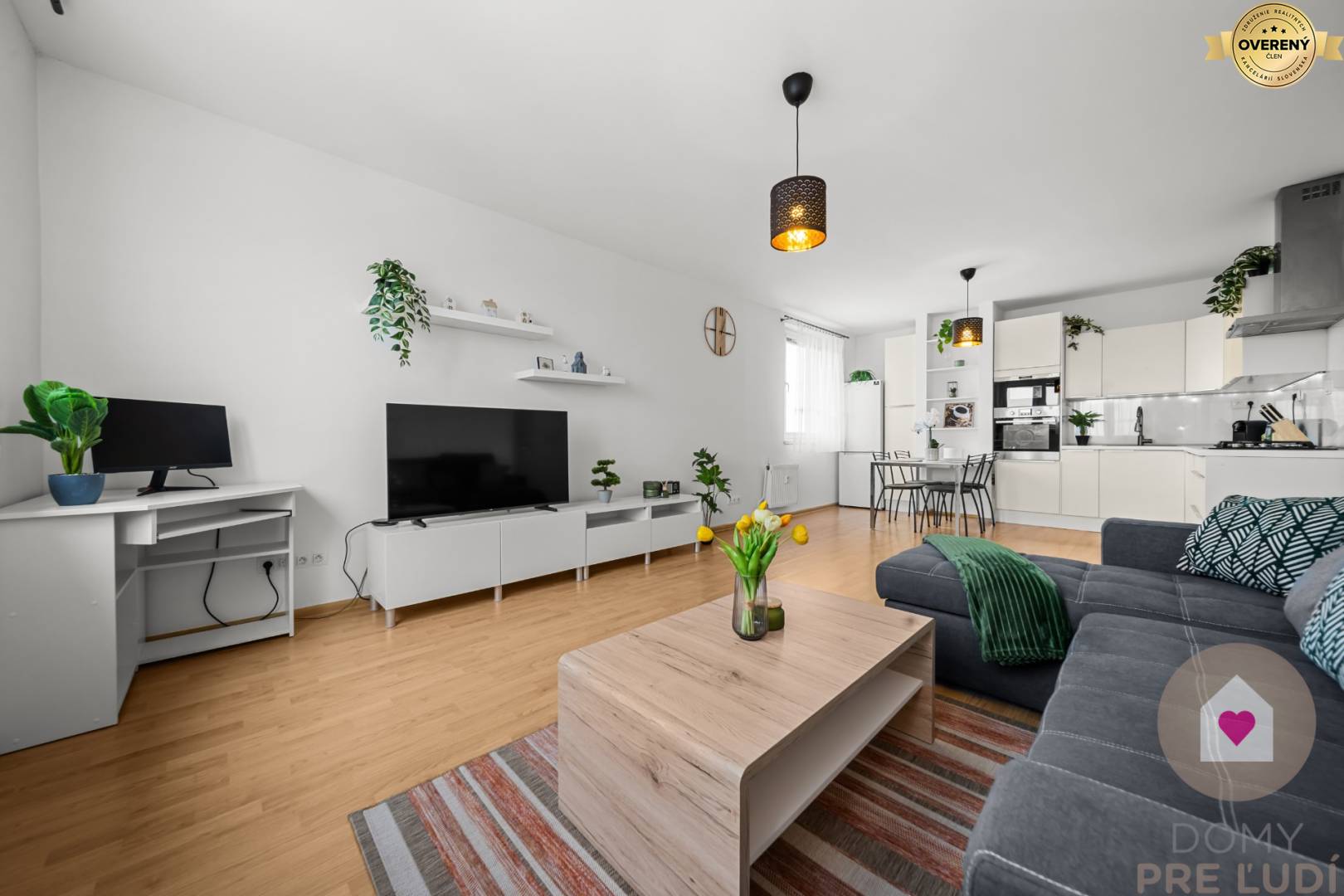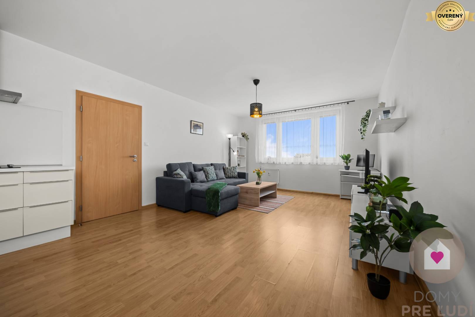 - priestranná obývacia izba spojená s kuchyňou o výmere 30,5 m2. Kuchyňa je vybavená s kuchynskou linkou so vstavanou plynovou varnou doskou, el. rúrou, umývačkou riadu, mikrovlnkou, digestorom, samostatne stojacou chladničkou s mrazničkou, jedálenským stolom so 4 stoličkami a skrinkou. Obývačka je zariadená s gaučom v tvare L, konferenčným stolíkom, skrinkou pod TV, skrinkou, pracovným stolíkom a poličkami. Majiteľ si berie gauč, konferenčný a pracovný stolík.
