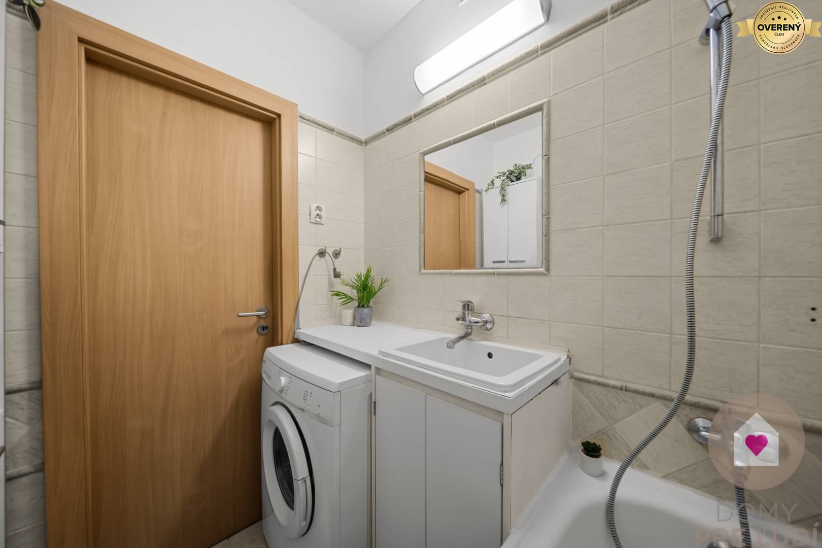 - samostatná kúpeľňa s vaňou, umývadlom, skrinkou pod umývadlom, kozmetickou skrinkou, zrkadlom a práčkou - 2,96 m2