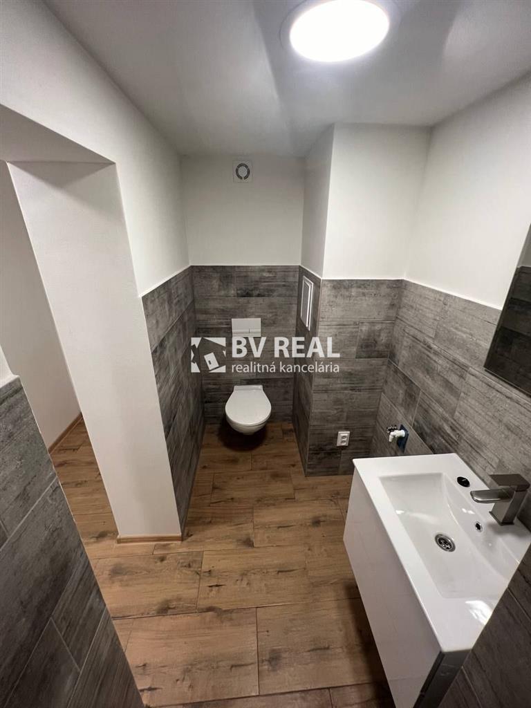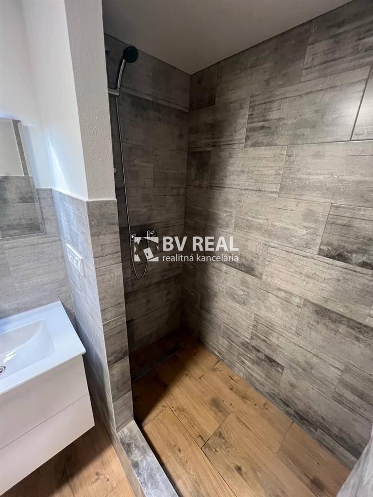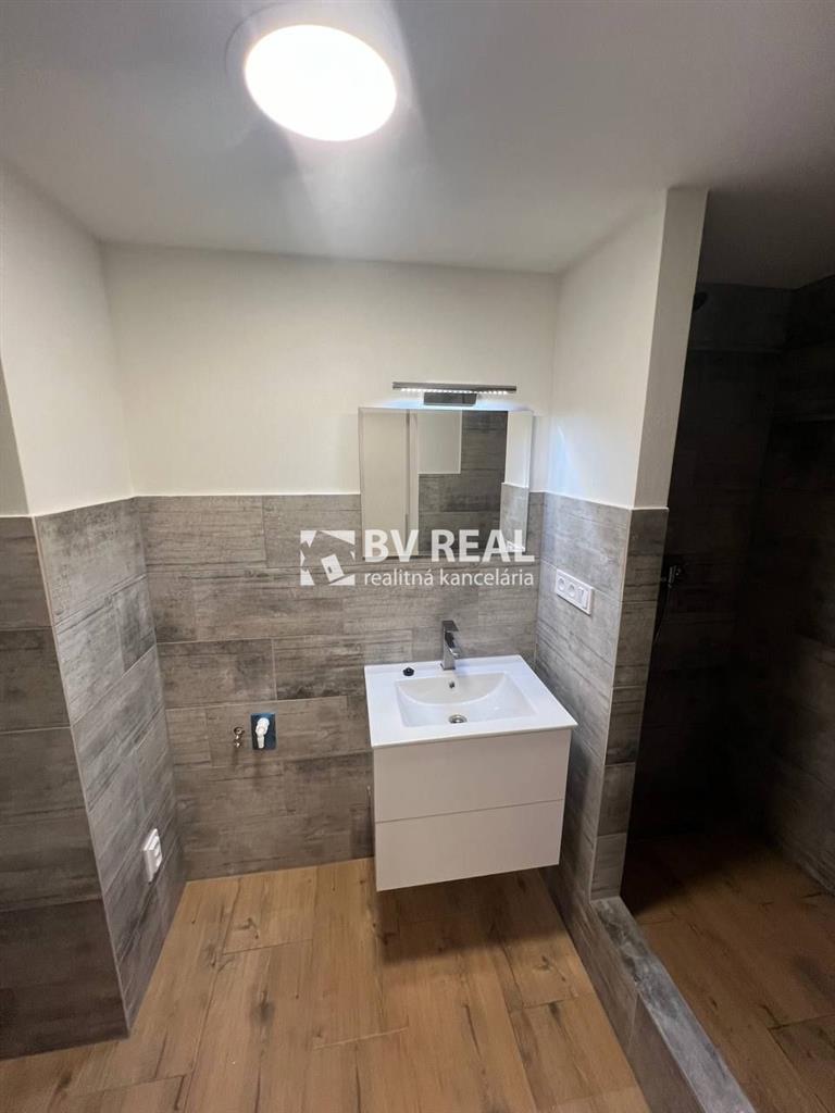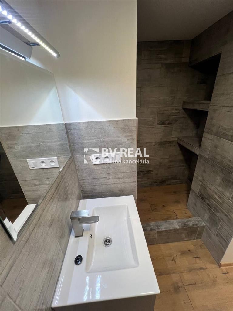 Murované bytové jadro, kde sa nachádza kúpeľňa so sprchovým kútom, umývadlom s kúpeľňovým nábytkom a podsvietené zrkadlom, s priestorom na práčku, s novými dlažbami a obkladmi, WC s geberitom.