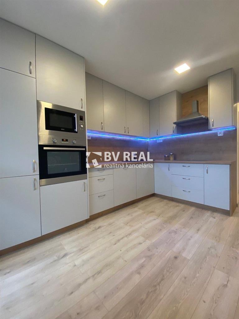 V kuchyni nová na mieru urobená rohová kuchynská linka s dresom, so zabudovateľnou varnou doskou a zabudovateľnou rúrou a mikrovlnkou, digestor, obklad, plávajúca podlaha, znižovaný strop.