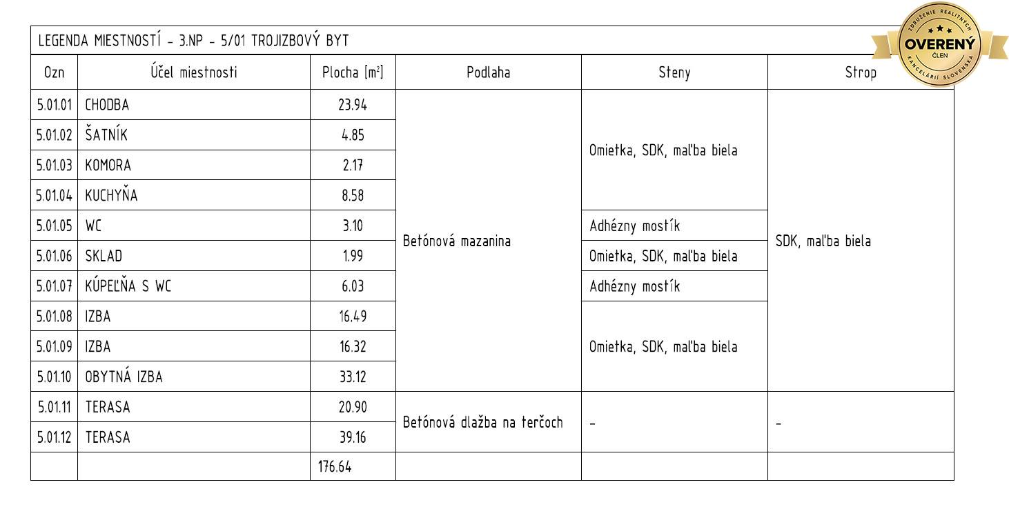 Byt pozostáva z chodby, kuchyne prepojenej s obývacou izbou, spálne, detskej izby, šatníka, komory, skladu, kúpeľňa a samostatného WC. K bytu patria dve terasy z ktorých jedna je prístupná z obývacej izby a druhá od kuchyne ako aj pivnica v podzemnom podlaží polyfunkčného domu. Výmera bytu je 120,98 m2, výmera pivníc je 7,76 m2 a 12,73 m2, výmera terás je 21,13 m2 a 38,4 m2. Byt je dokončený v štandarde, vstupné dvere do bytu sú bezpečnostné (ADLO), interiérové dvere sú drevené osadené do drevených zárubní, okná sú hliníkové s izolačným trojsklom.