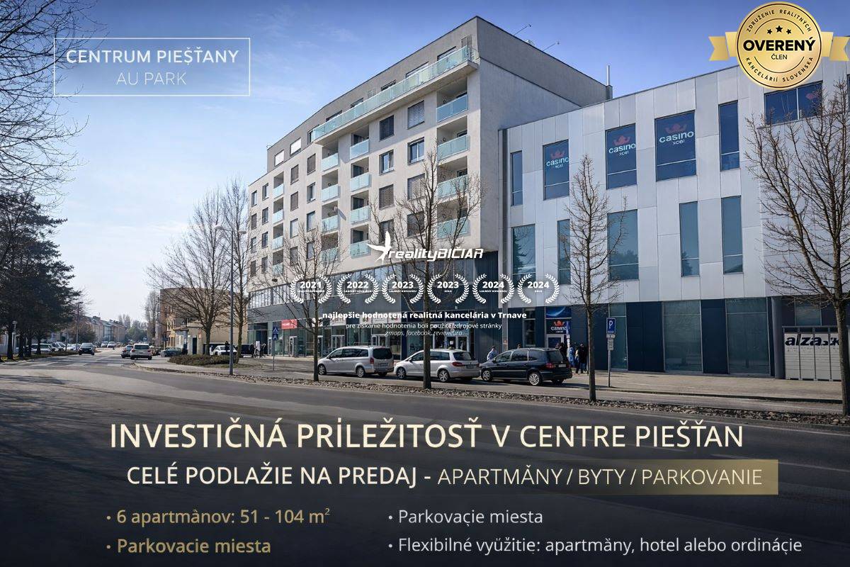 Ponúkame na predaj celé podlažie v prestížnej lokalite úplného centra mesta Piešťany, ktoré je súčasťou známeho obchodného centra Aupark. Táto nehnuteľnosť predstavuje výnimočnú investičnú príležitosť s vysokým potenciálom zhodnotenia – vhodná pre developera, investora, ale aj na individuálny predaj jednotlivých jednotiek.
