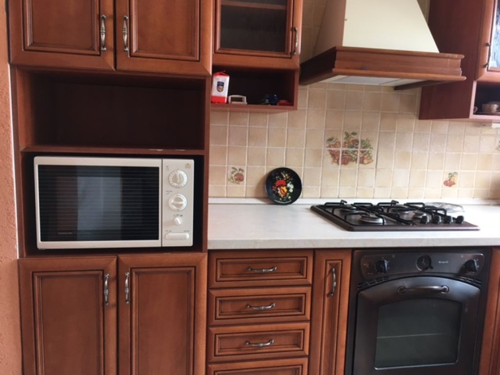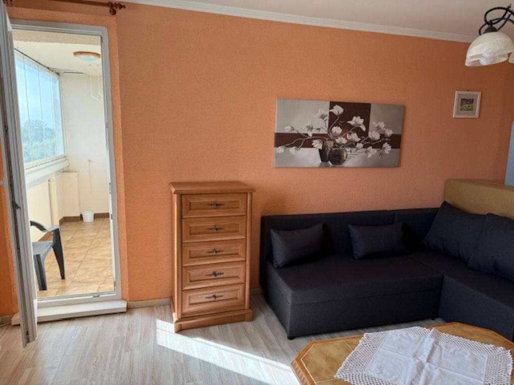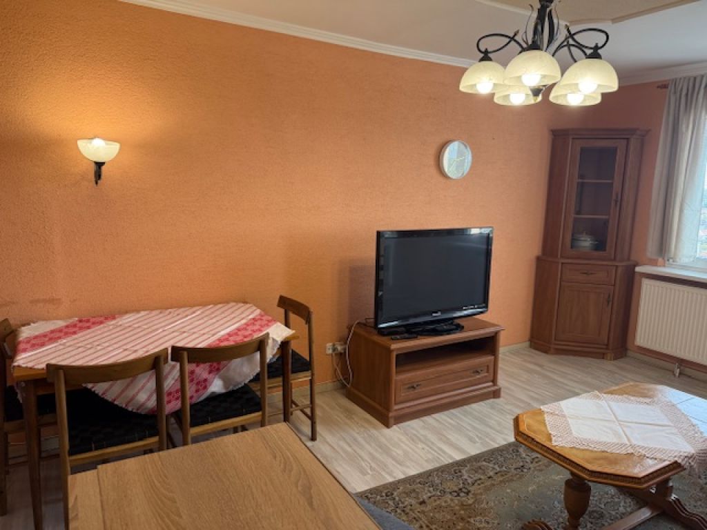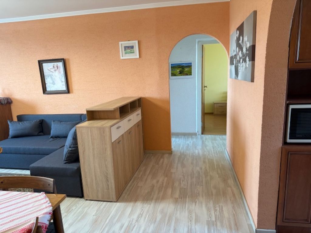 Pozostáva z obývacej izby (odtiaľ je vchod na veľkú loggiu), samostatná kuchyňa, spálňa, pracovňa. samostatná kúpeľňa, oddelené WC, šatník. Byt je priestranný, má 72 m2 , je komplet zariadený aj so všetkými elektrickými spotrebičmi (elektrická rúra, plynový šporák, digestor, mikrovlnka, veľká chladnička s mrazničkou, umývačka riadu, káblová televízia, pračka, vysávač). Kuchyňa je vybavená jedálenskou súpravou, príbormi, atď. Podlaha: dlažba, plávajúca podlaha. Steny: stierky. Okná: plastové so sieťkami a vodorovnými žaluziami. V spálni a v pracovni sú vstavané skrine na celú stenu. V suteréne je možné odkladať bicykel.
