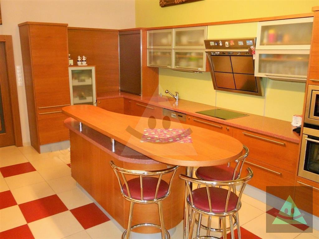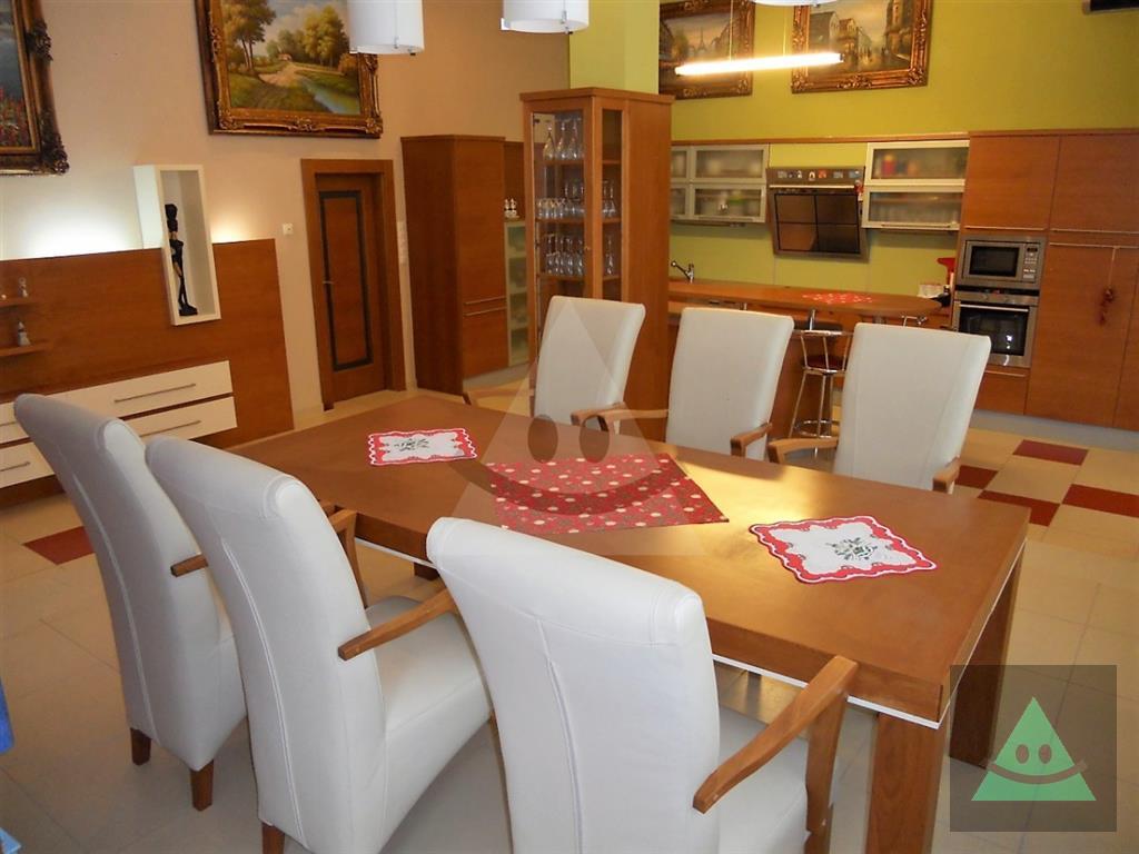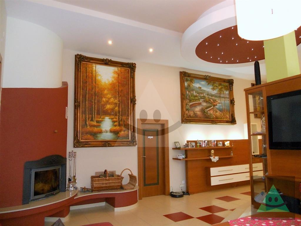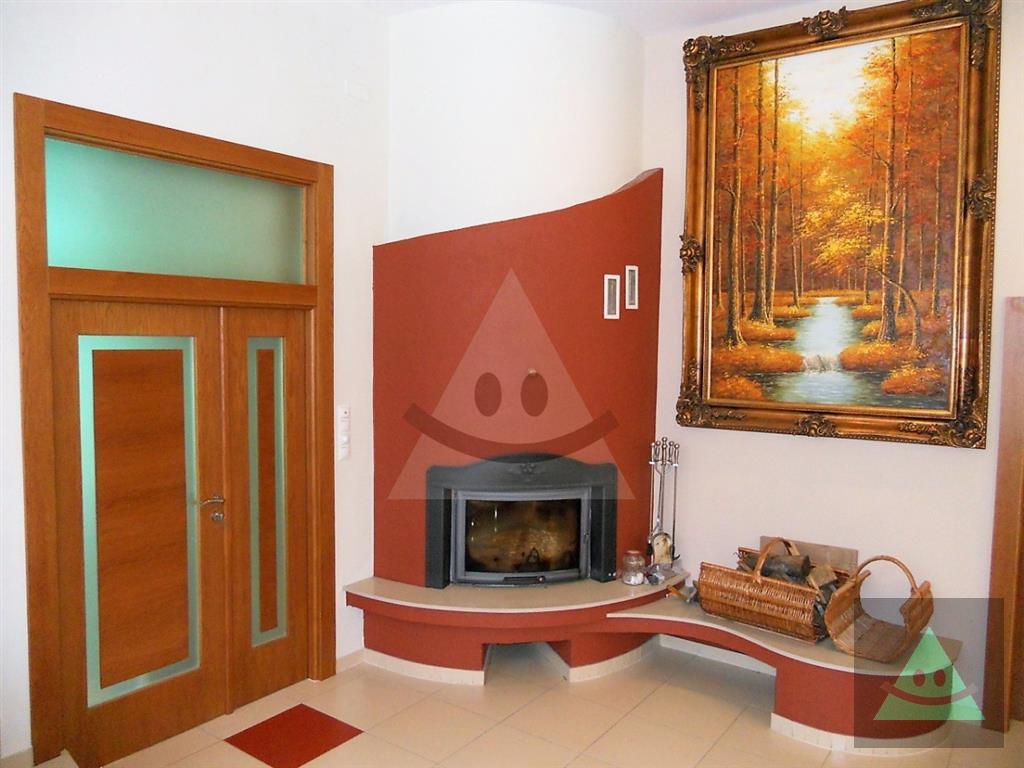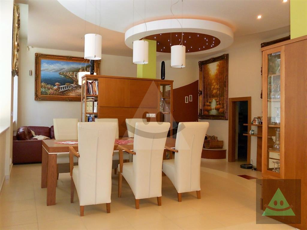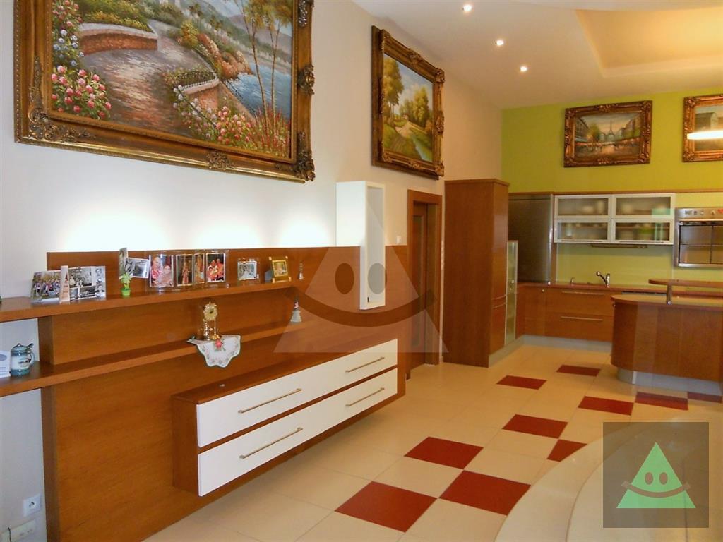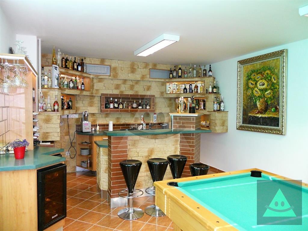 Celková úžitková plocha je 205 m2 x 2, spolu 410 m2. Na prízemí sa nachádza vchod do rodinného domu. Po prejdení sa ocitneme v predsieni. Z nej vedú dvere do obytnej časti na prízemí, schody do podkrovia, šatníka s WC, hosťovského WC a do " pánskej časti " domu, kde sa nachádza barový pult, biliardový a kartársky stôl. Po prejdení do obytnej časti domu na prízemí sa ocitneme v priestrannej miestnosti, v ktorej sú sektorovo oddelená obývačka, jedáleň a kuchyňa s barovým ostrovčekom. Vedľa je hneď miestnosť mini wellnessu s jednou masážnou vaňou, obyčajnou vaňou, sprchovým kútom a fínskou saunou pre 8 až 10 osôb. Ďalšou miestnosťou v tejto časti domu je izba, momentálne zariadená ako detská izba. V podkrovnej časti sa nachádzajú okrem kúpeľne ďalšie miestnosti, ktoré slúžia jednak ako hosťovská izba a druhá ako priestranná detská izba. Okná na dome sú hliníkové. Strecha je šindľová a odizolovaná niekoľkými vrstvami, strop je sádrokartonový. Rekonštrukcia bola v roku 2014. Podlahy sú mramorové, keramické a plávajúca podlaha. Kúrenie je zabezpečené kombinovane podlahovým kúrením - vodným, pevným palivom v kozube, z ktorého vedú prieduchy do ostatných izieb a v ktorých sú ventilátory. Teplá voda je zabezpečená jednak plynovým kotlom ako aj elektrickým bojlerom. Žiarivky sú všade LED úsporné.