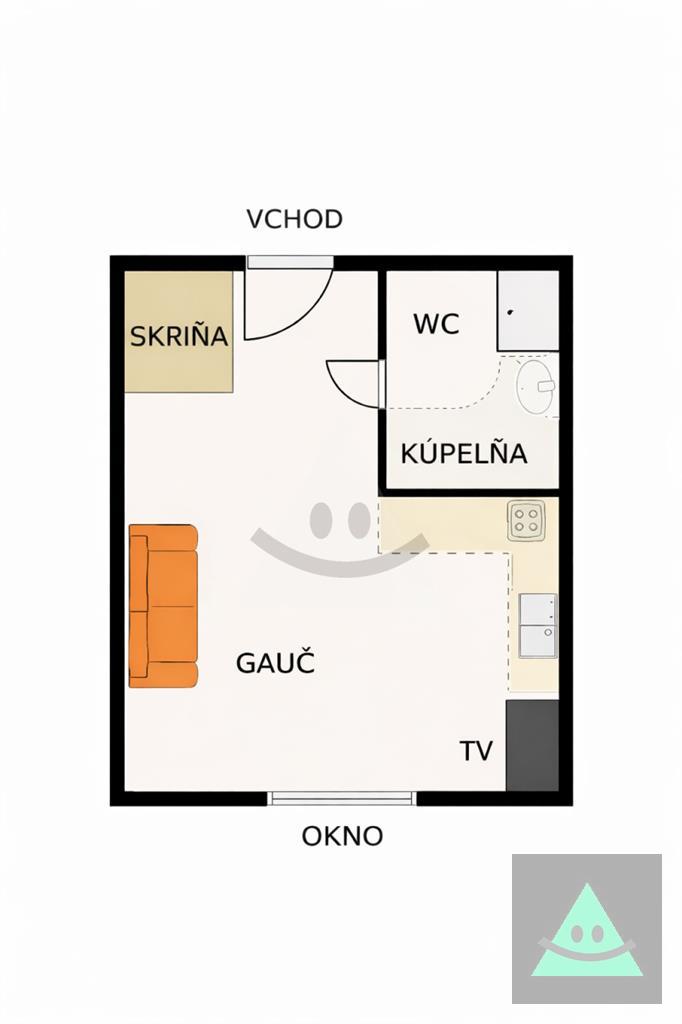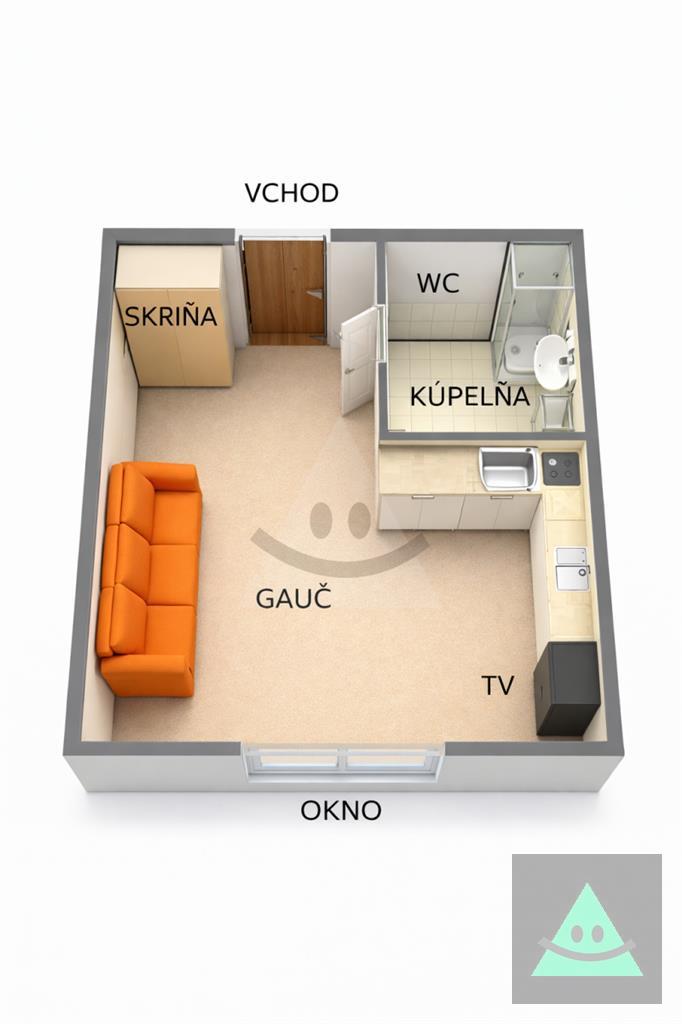 Pozostáva z obývacej izby/ spálne s vlastnou kupeľňou s WC a kuchynským kútikom.
