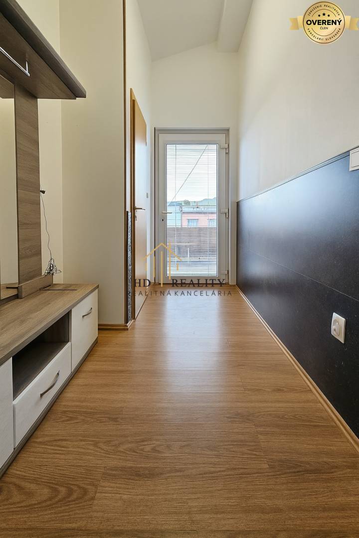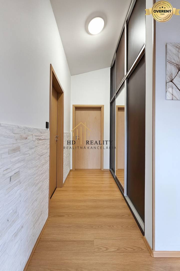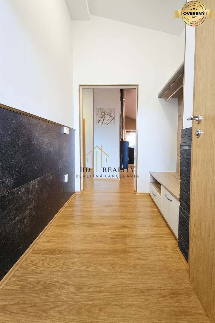 Už pri vstupe vás privíta priestranná chodba so samostatnou toaletou. Vpravo sa otvára veľká obývacia izba spojená s modernou kuchyňou a jedálenským kútom. Odtiaľto vedú veľké zasúvacie dvere priamo na krytú terasu.