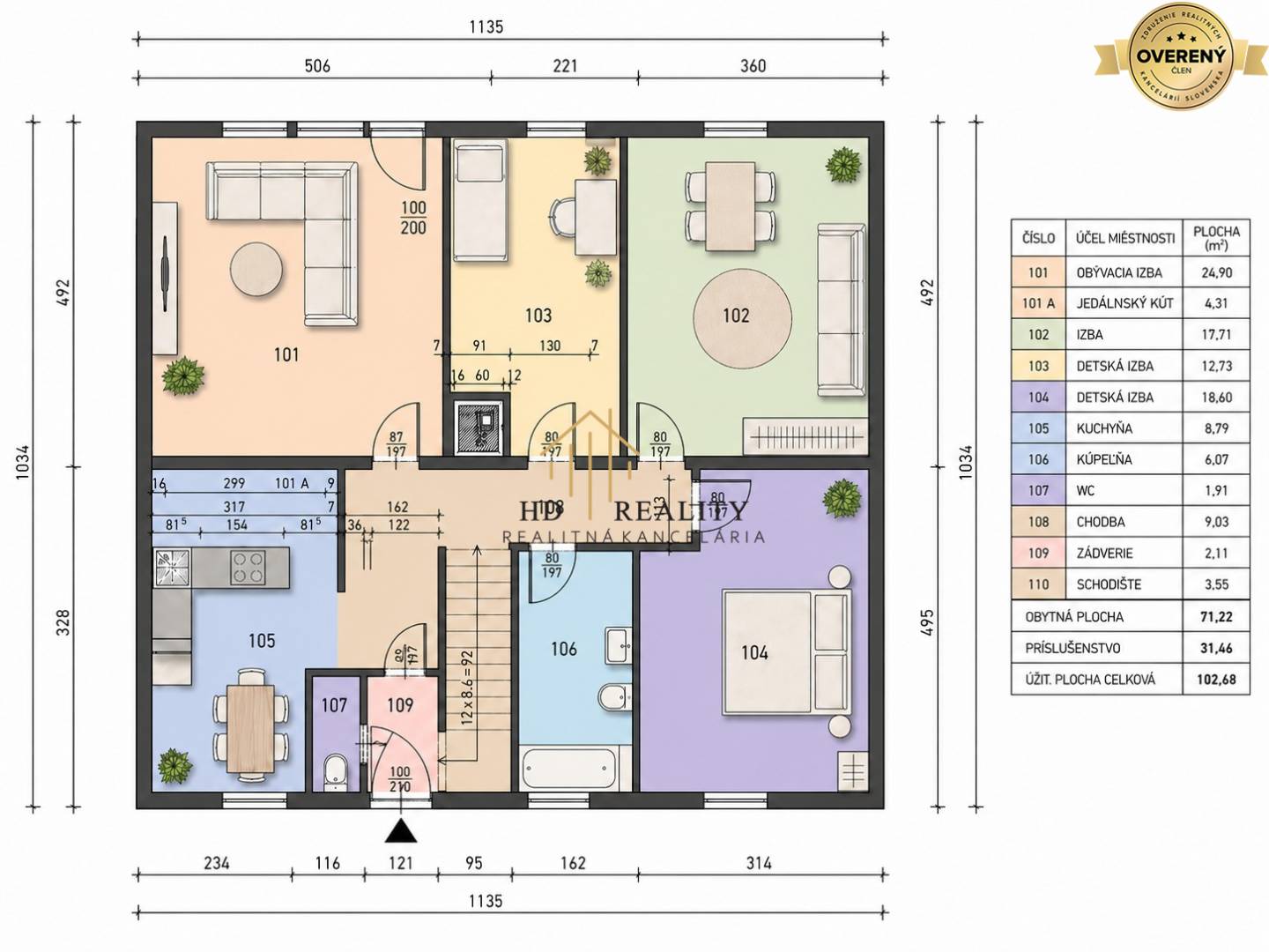 Dispozícia prirodzene oddeľuje dennú a nočnú časť domu, pričom izby sú nepriechodné a poskytujú dostatok súkromia.