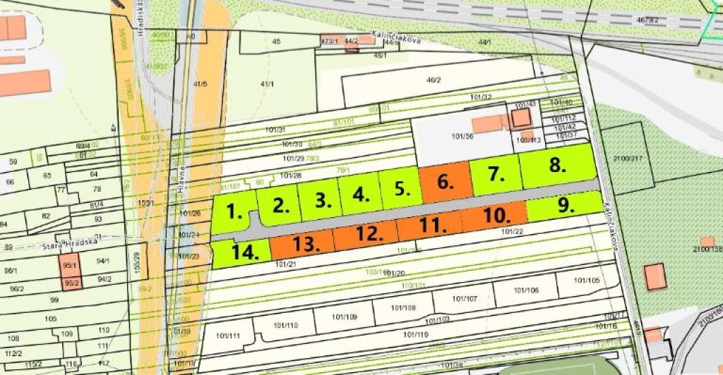 🟧 Oranžovou farbou sú vyznačené rezervované pozemky.