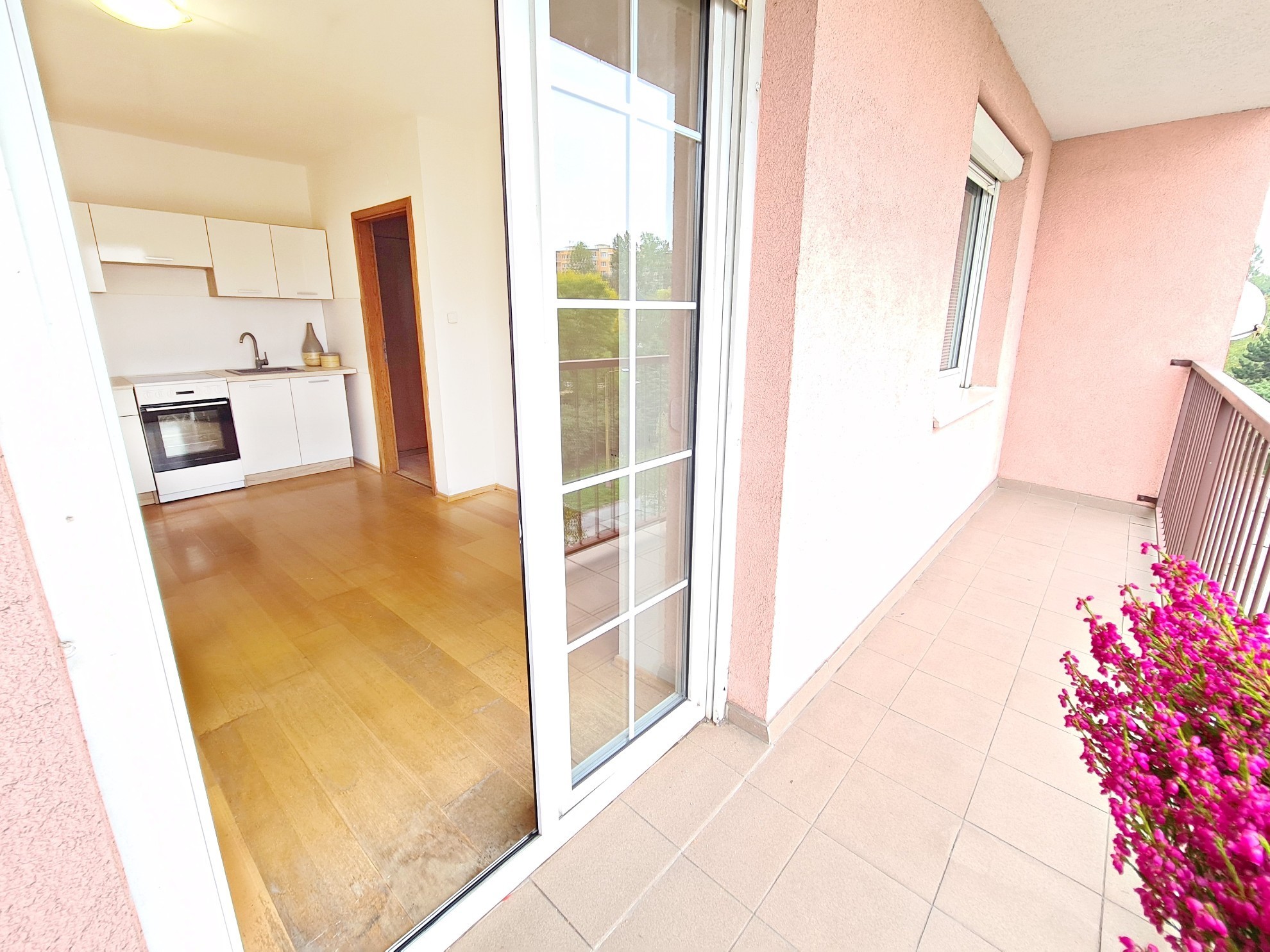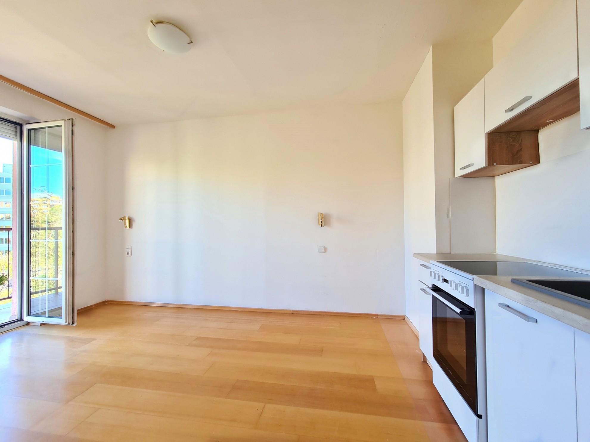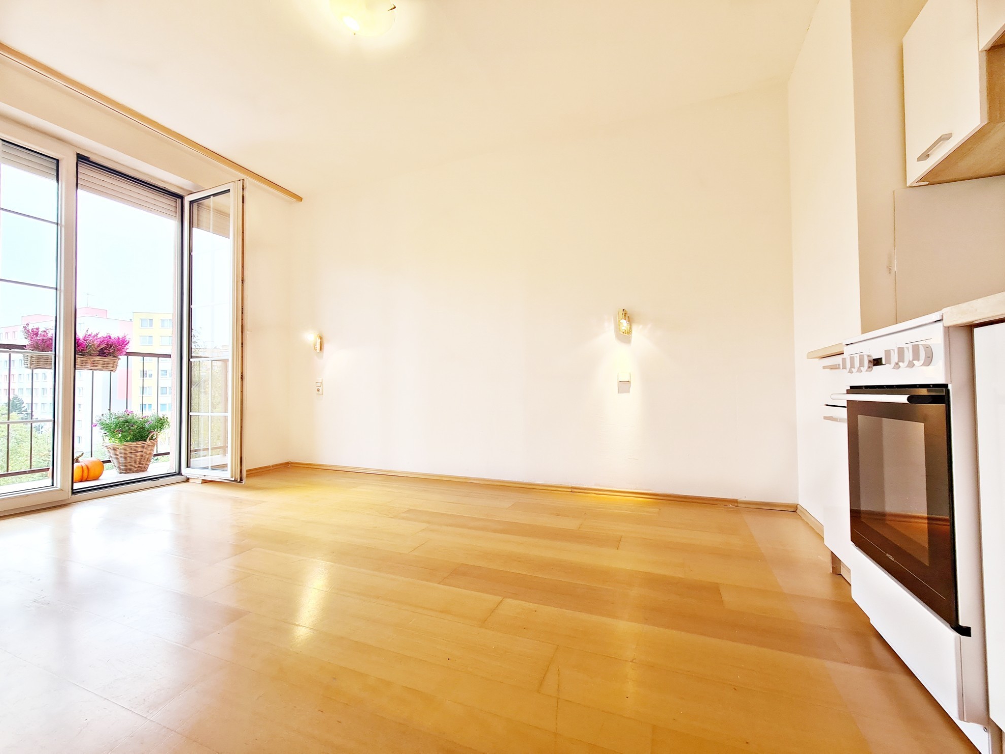 - Obývačka s kuchynským kútom a s východom na loggiu s 2-krídlovým francúzskym oknom.