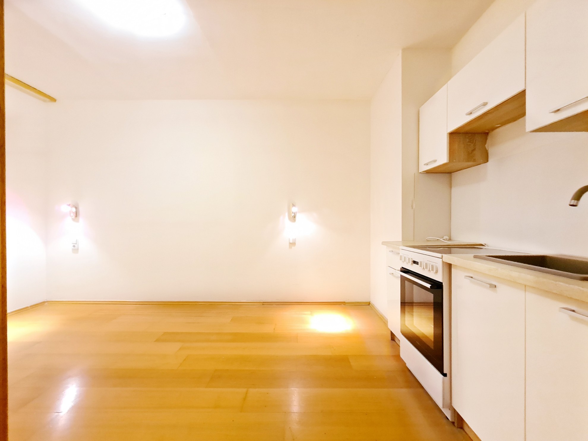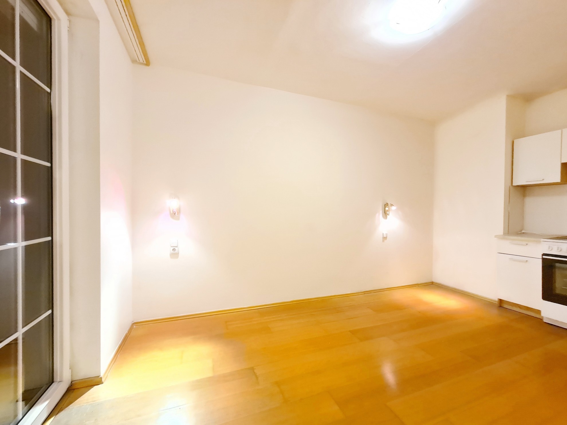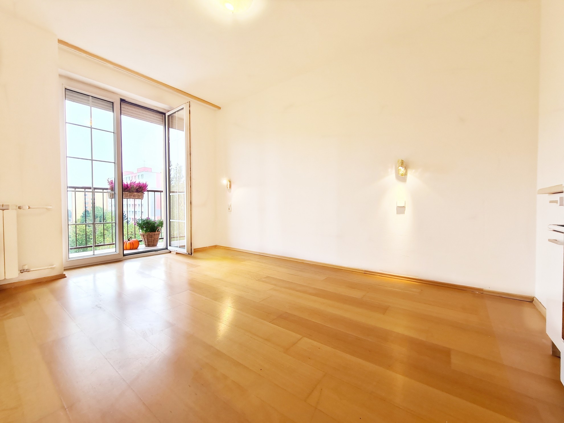 - Obývačka s kuchynským kútom a s východom na loggiu s 2-krídlovým francúzskym oknom.