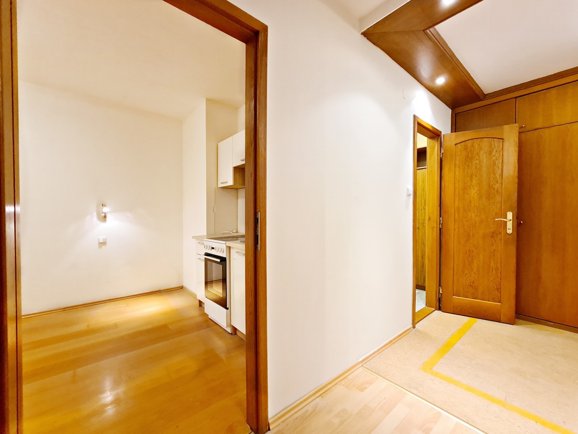 Atmosféru bytu dotvárajú elegantné zárubne s tmavším dreveným dekorom a dvere z masívu.