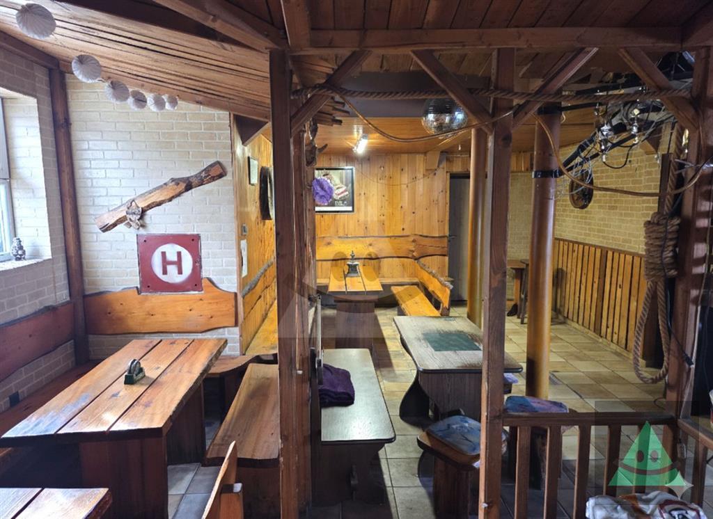 Hlavnou časťou: veľká priestranná miestnosť pre hostí s barom a krbom, 2 menšie miestnosti vužívané ako skladovacie priestory, sociálne zariadenie (zvlášť muži aj ženy).