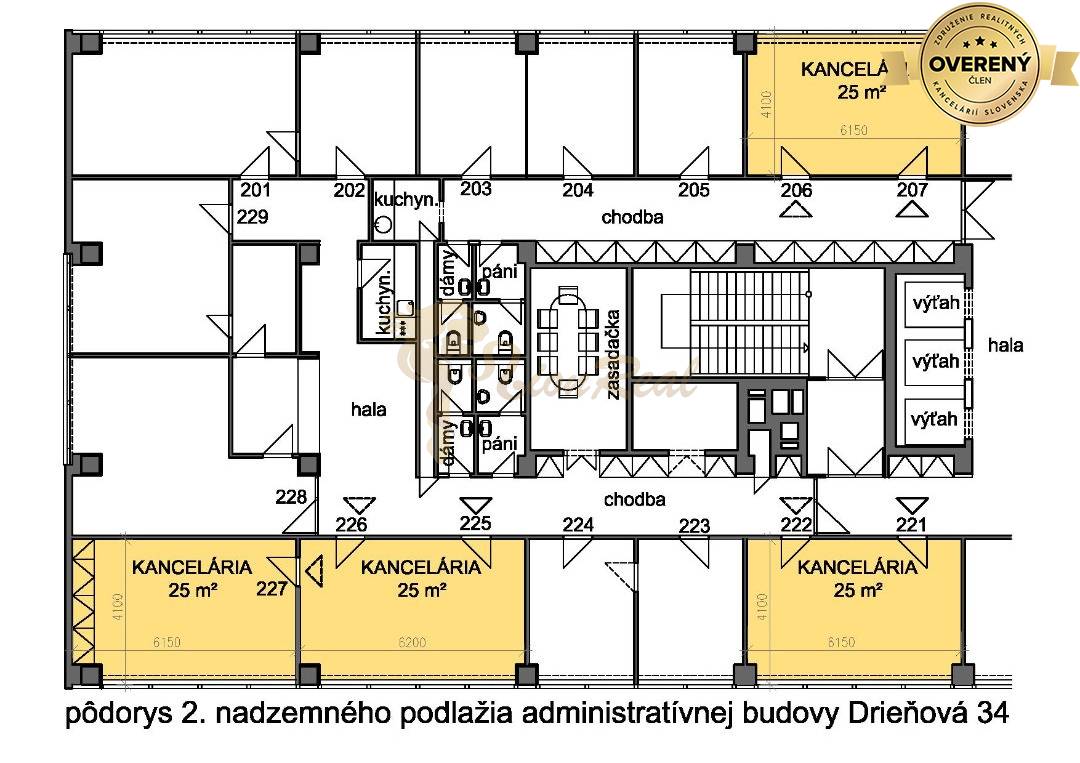Dáme do prenájmu kancelársky priestor o výmere 25 m2 kanc. č. 206 (207) v administratívnej budove na ul. Drieňova ulici 34 v Bratislave 2. (Ružinov), na druhom poschodí. Kancelária je prístupná tromi výťahmi, jedným schodiskom priebežným cez všetkých 10. podlaží budovy alebo druhým reprezentačným schodiskom, ktoré vedie z prízemia priamo iba na 2. podlažie do priestrannej haly.