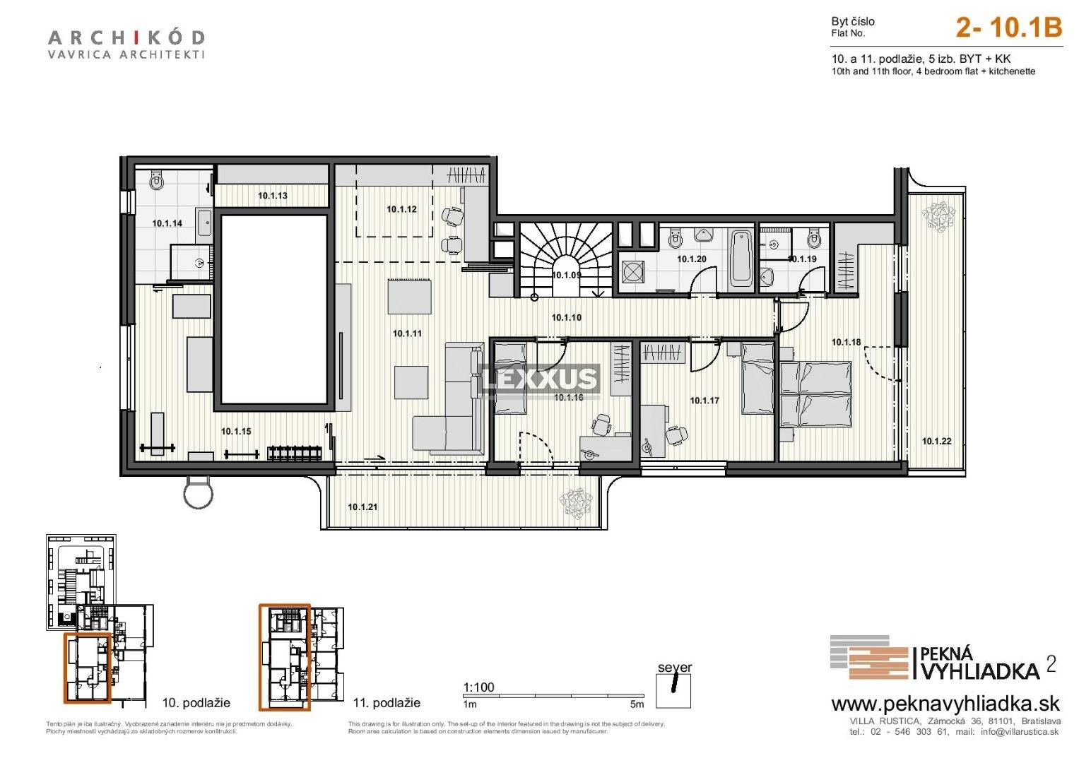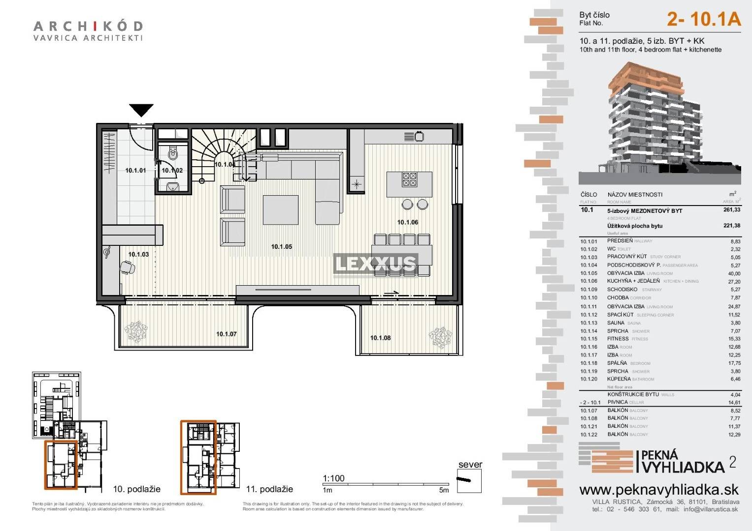 Luxusný mezonet 2-10.1 ponúka nadštandardný priestorový komfort s podlahovou plochou 207 m2, v ktorej sa nachádza 5 izieb ale aj fitness, sauna, samostatný spací kút a pracovný kút, exteriéry v podobe 4 balkónov o celkovej rozlohe 39,95 m2 a pivnica o rozlohe 14,61 m2.
