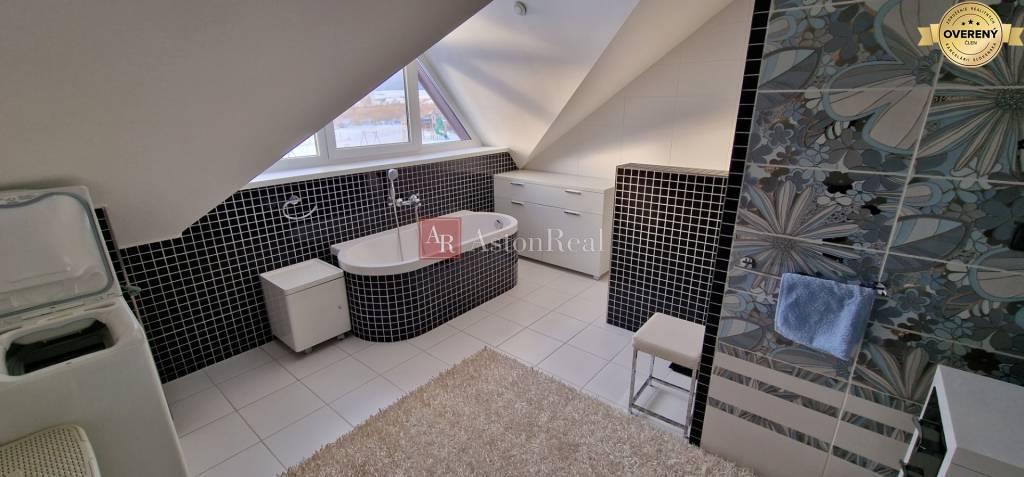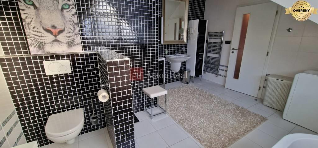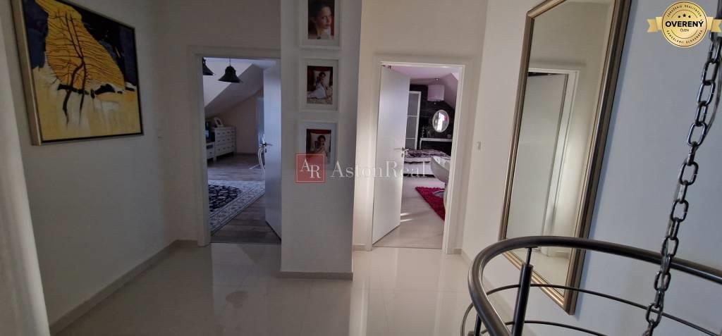 Na vrchnom podlaží je: - chodba, odkiaľ je vstup do dvoch samostatných časti, kde v jednej je hosťovská veľká izba, veľká kúpelňa s WC, spálňa, balkón a v druhej časti je obývačka so spálňou, kúpelňa s WC, balkón.
