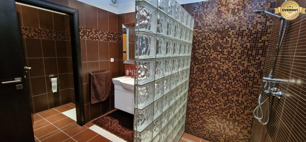 Na vrchnom podlaží je: - chodba, odkiaľ je vstup do dvoch samostatných časti, kde v jednej je hosťovská veľká izba, veľká kúpelňa s WC, spálňa, balkón a v druhej časti je obývačka so spálňou, kúpelňa s WC, balkón.