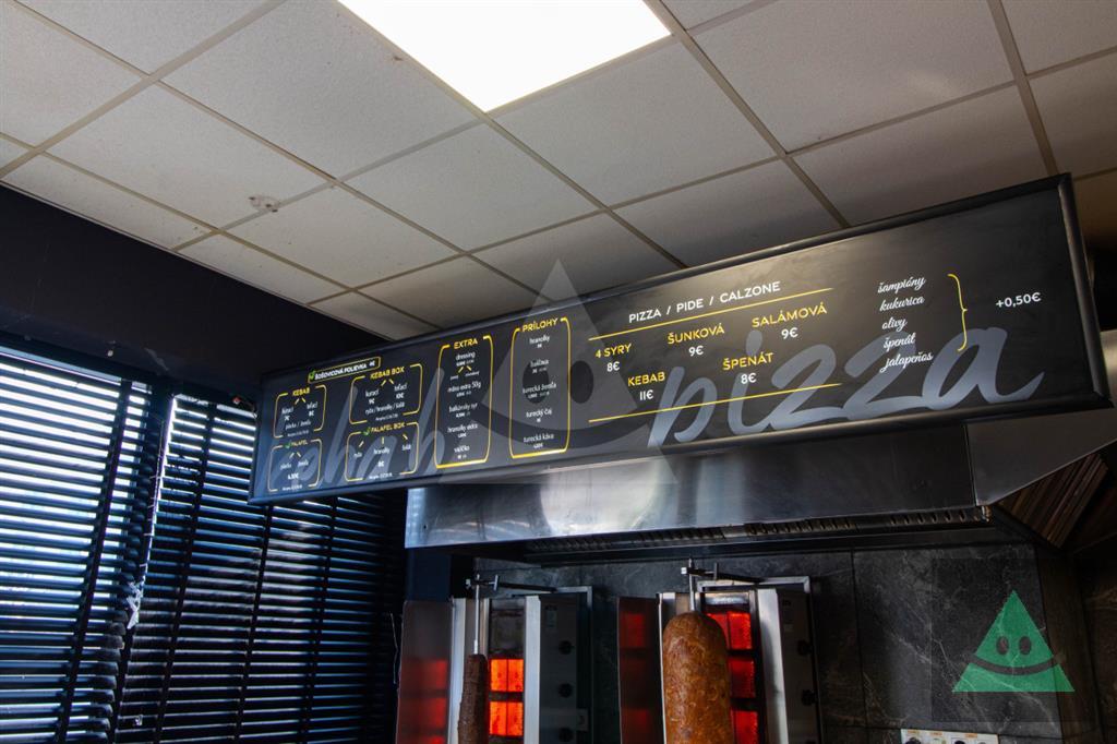 Vybavenie prevádzky (komplet)Miešačky cesta, veľký truhlicový mraziak, malá mraznička, chladnička Coca-Cola (2×), 2× fritéza, mikrovlnka, indukčná dvojplatnička, iPad, kávovar na tureckú kávu, kanvica, TV, klimatizácia, chladiaca vitrína na dezerty, gril, pizza pec, 2× chladiaci stôl, chladiaca vitrína, váha, ohrievač mäsa, 2× gril na mäso, krájač mäsa, kompletné bežné vybavenie kuchyne a prevádzky (taniere, misky, poháre, príbory, hrnce, panvice, gastro náradie, drobný inventár a pod.) a zázemie pre zákazníkov vrátane nábytku (stoly, stoličky a ďalšie vybavenie podľa dohody).