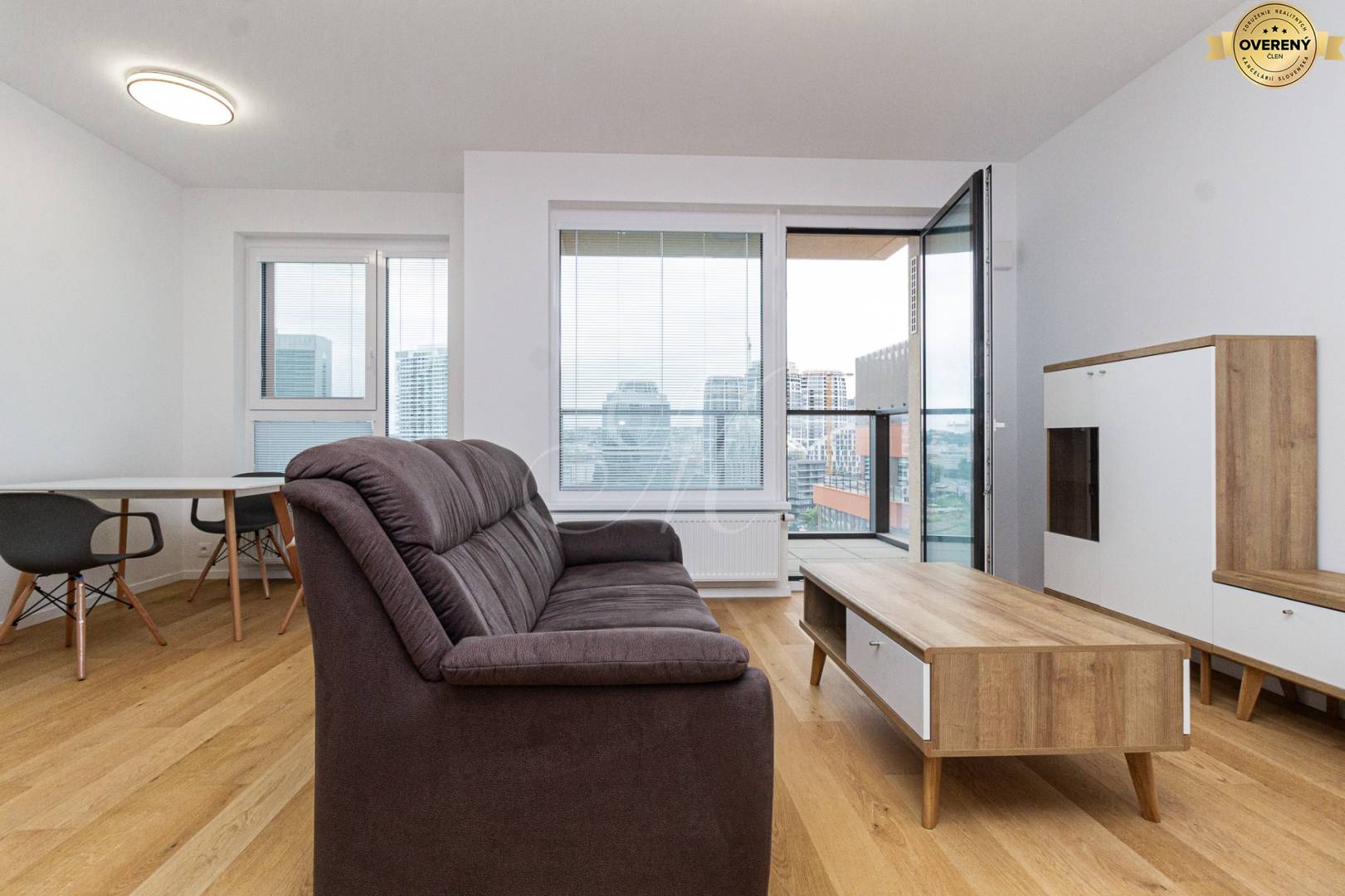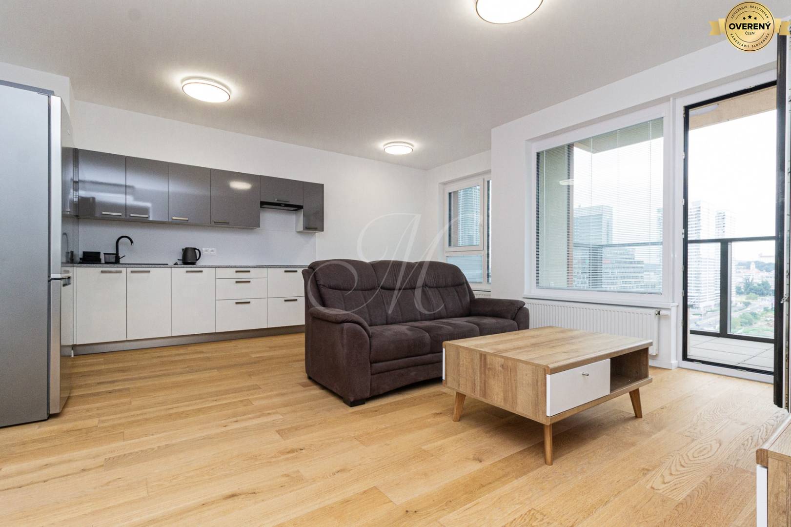 Dispozične je riešený vstupnou halou s úložným priestorom, obývacou miestnosťou s prístupom na balkón s výhľadom na mesto a Bratislavský hrad, prepojenou s plne vybavenou kuchyňou so spotrebičmi (chladnička, mraznička, el. rúra, sporák, umývačka riadu, digestor) a jedálenskou časťou, samostatnou spálňou so vstavanou skriňou, kúpeľňou s vaňou, práčkou a sušičkou a oddeleným WC.