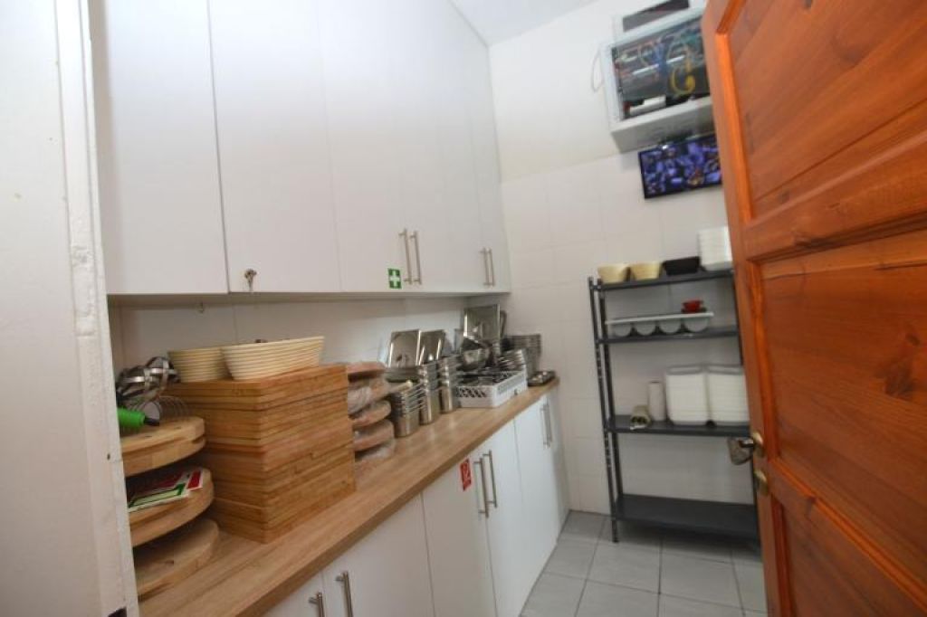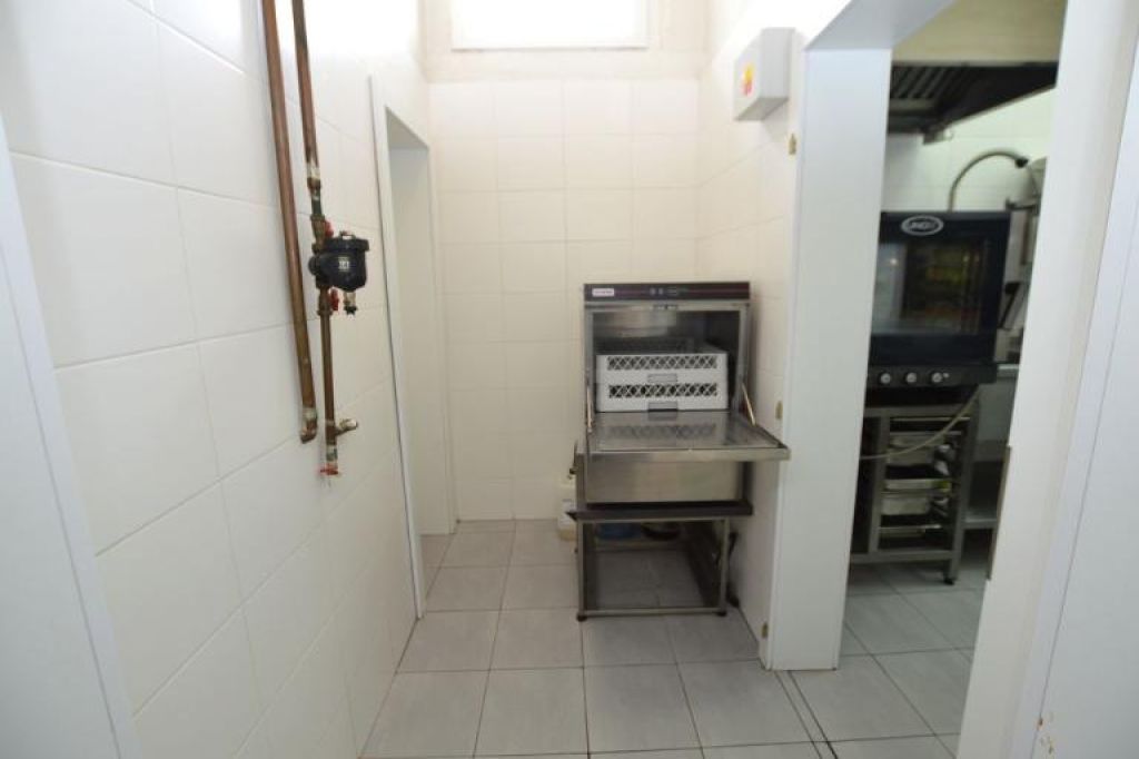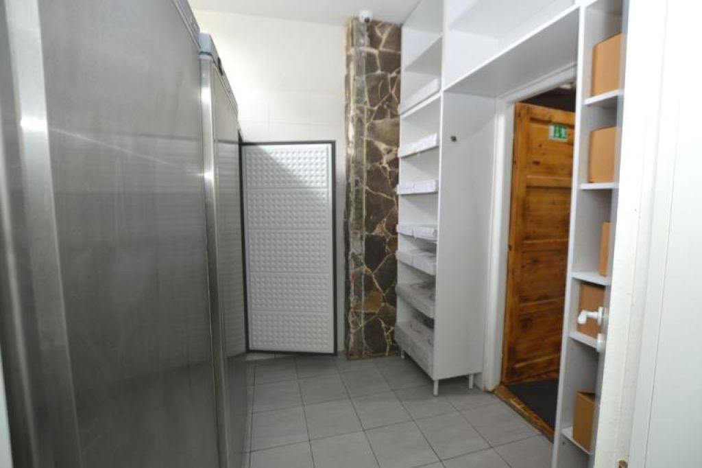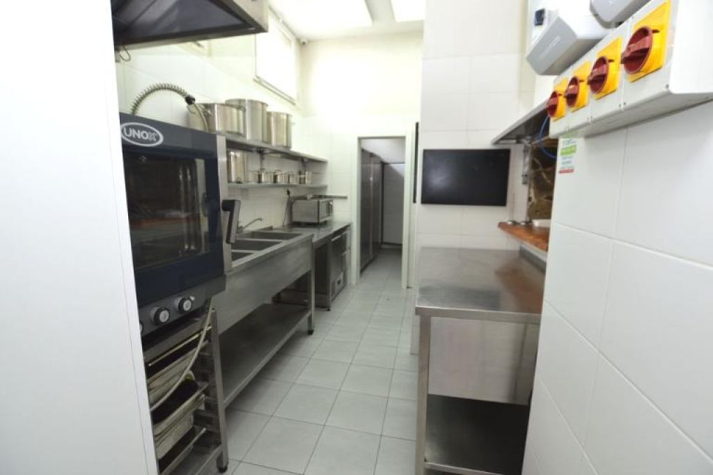 Pracovná časť na prízemí: kuchynská linka, kuchynský priestor, priestor pre chladničky, služobné WC s elektrickým kotlom a zásobníkom teplej vody.