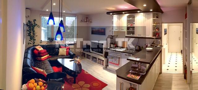 Priestranná obývačka v strede bytu je spojená s kuchyňou, je v nej miesto na kuchynský stôl, bielu kuchynskú linku a tiež prakticky využiteľný veľký ROLLDOR so zrkadlami, ktorý umocňuje príjemný dojem z bytu v jednom štýle a celistvosti premyslene zariadeného interiéru.