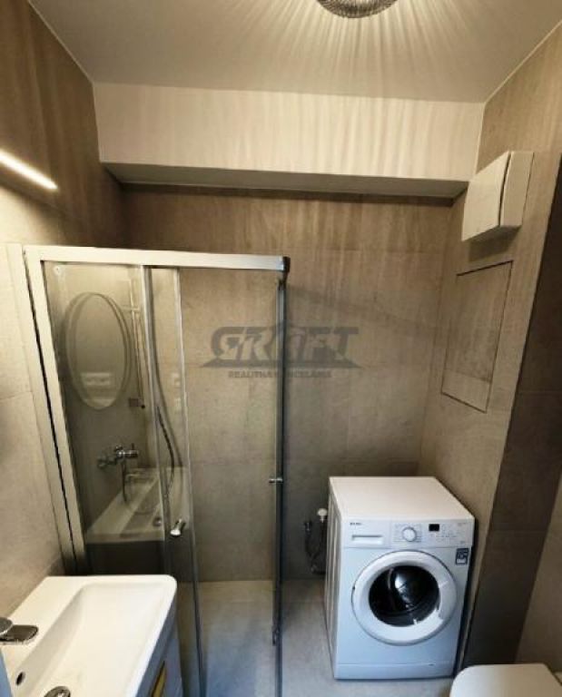Kúpeľňa so sprchovacím kútom, toaletou a práčkou.