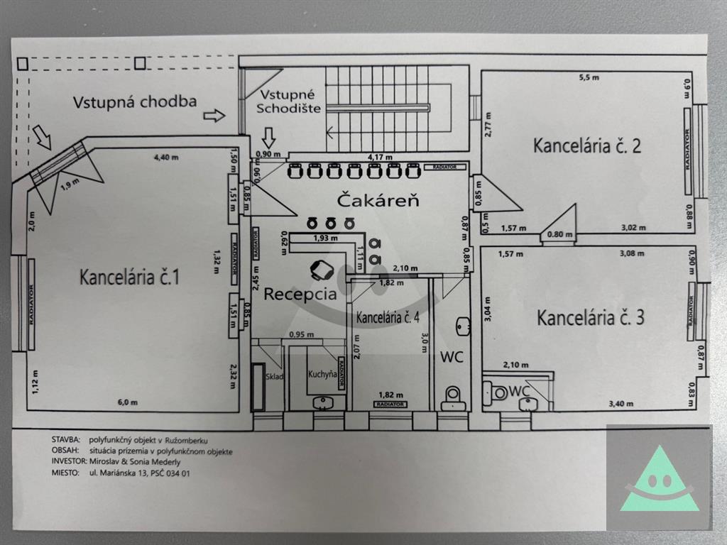 - 2 samostatné kancelárie, (v pôdoryse kancelária č.1 a č.4), 2 samostatné vstupy, recepcia