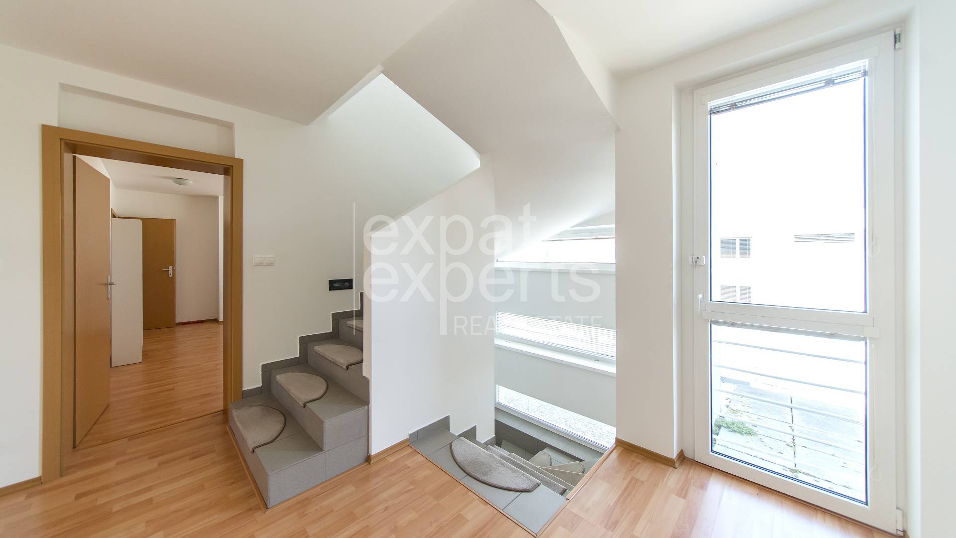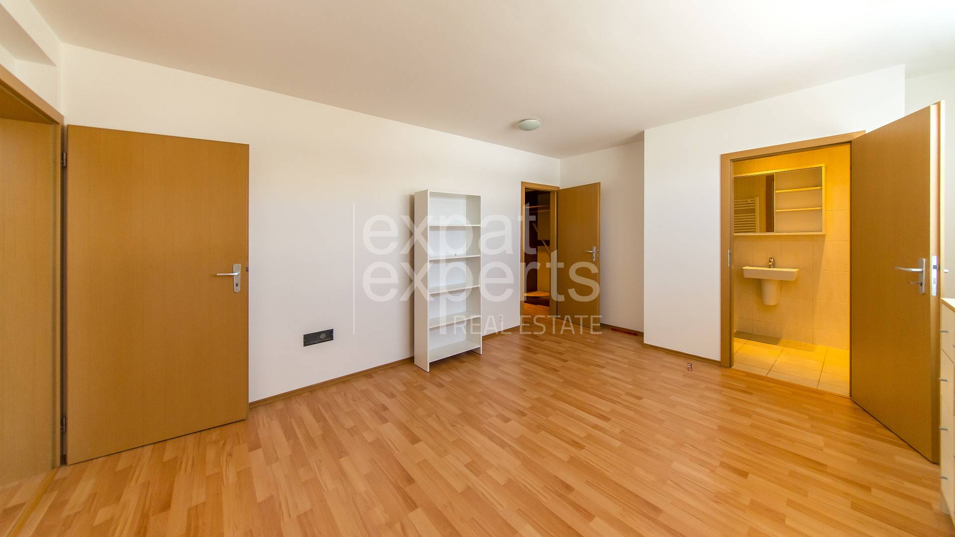 1. poschodie: hlavná spálňa so vstupom na terasu, šatníkom a kúpeľňou s rohovou vaňou a WC, 2x spálňa so vstupom na terasu, vlastným šatníkom a vlastnou kúpeľňou so sprchovacím kútom a WC.