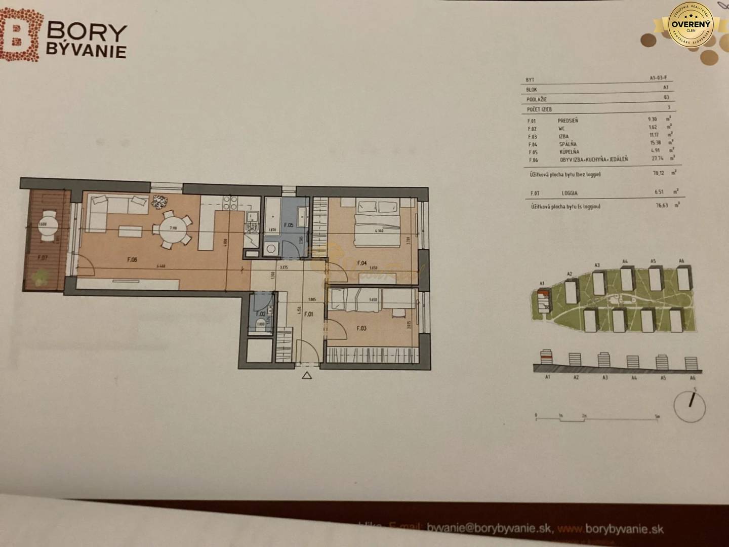 Výmera 76,63 m2 (byt 70,12 m2 + lodžia 6,51 m2), nachádza sa na 3.p./5.