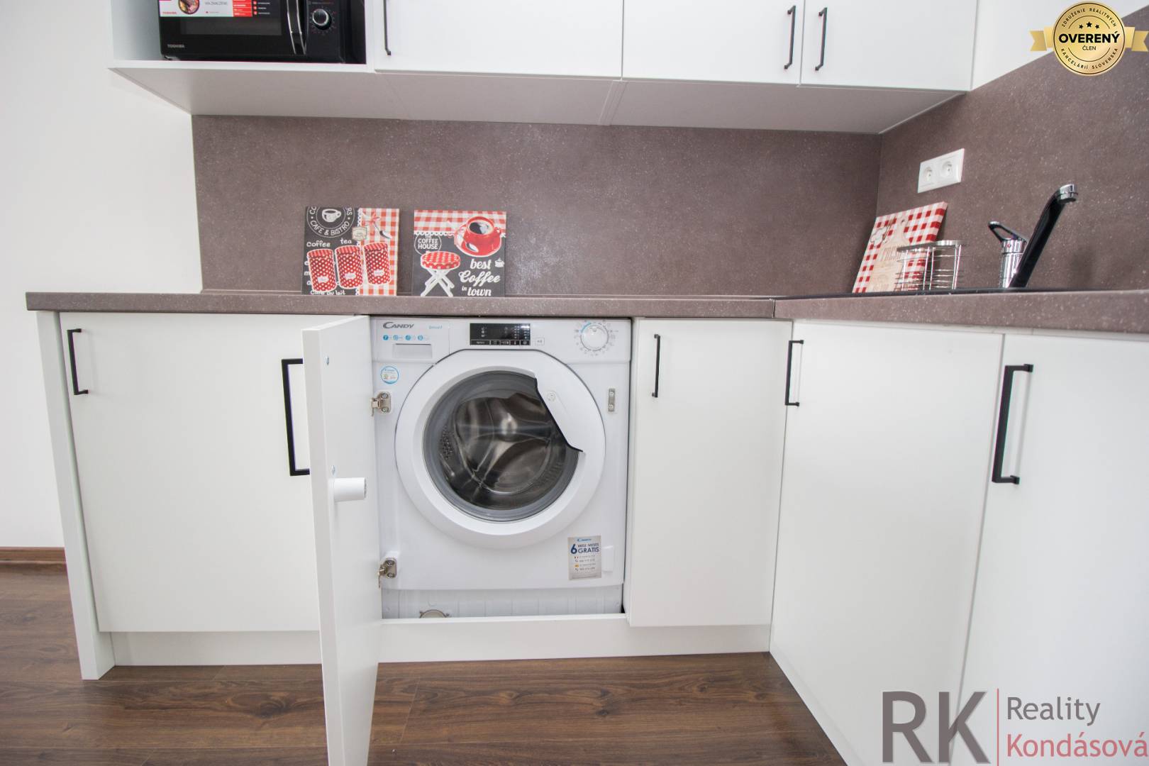 V kuchyni je vstavaná chladnička, vstavaná automatická práčka, mikrovlná rúra s grilom,