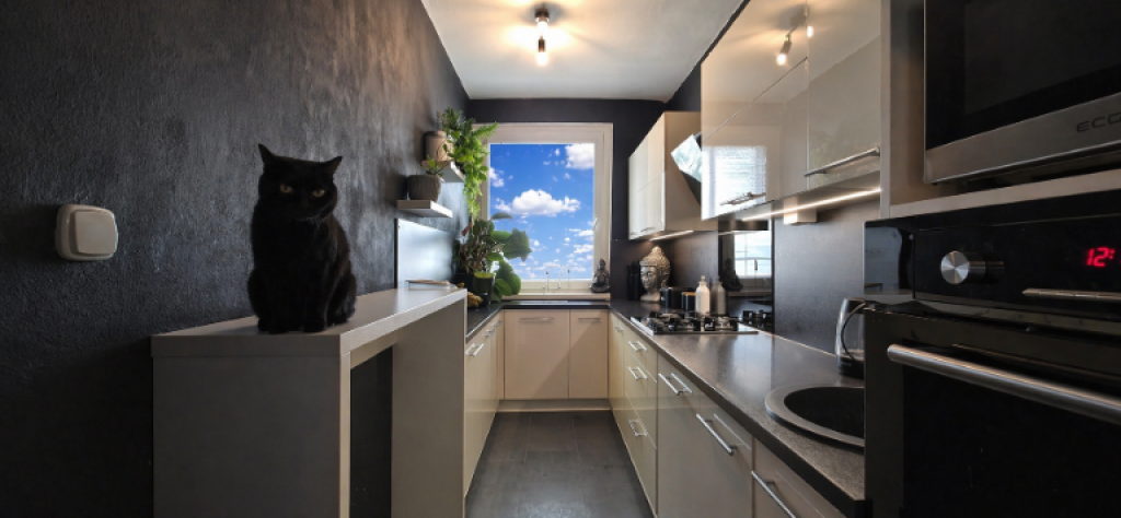 Byt pôsobí ako prémiový priestor hodný butikového hotela. Moderná kuchyňa s lesklou kuchynskou linkou, čiernou pracovnou doskou a plnou výbavou spotrebičov je rovnako funkčná ako estetická. Obývacia izba s kazetovým podhľadom a bodovým osvetlením ponúka príjemný a útulný priestor na relax. Spálňa s pódiom, dreveným panelom a kazetovým stropom dotvára konzistentný dizajnový koncept celého bytu.