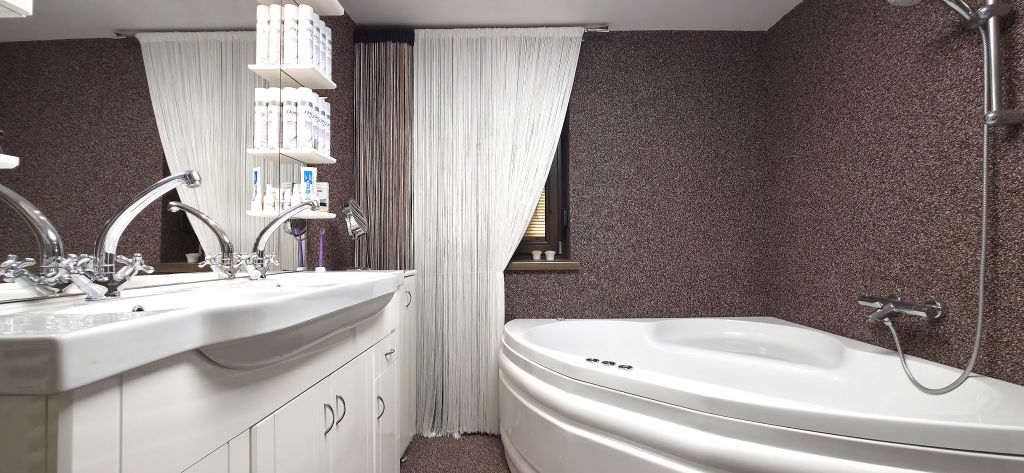 Kúpeľňa: Vybavená masážnou rohovou vaňou aj sprchovým kútom + samostatné WC.