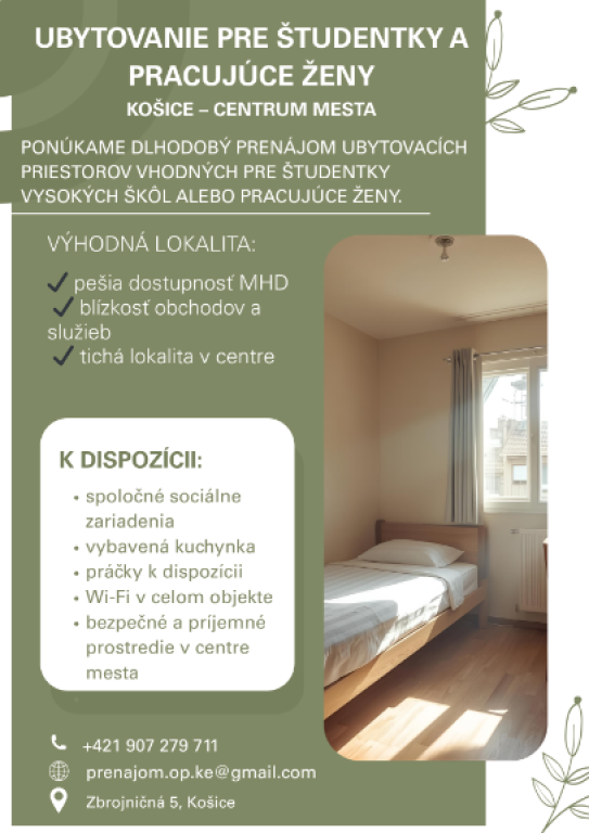 Ponúkame dlhodobý prenájom vhodný pre študentky vysokých škôl ako aj pracujúce ženy.