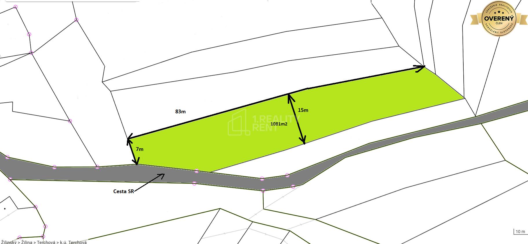 1.Reality Rent vám ponúka na predaj krásny pozemok vo vyhľadávanej turistickej oblasti Slovenska, v Malej Fatre priamo v obci Terchová. Pozemok má výmeru 1081m2, jeho parametre sú zakreslené na obrázku v inzeráte. Pozemok je určený na výstavbu rekreačných objektov. Momentálne na pozemku nie sú žiadne IS, elektrika už bola v minulosti schválená s bodom napojenia, bude treba obnoviť žiadosť. Vodu je nutné riešiť studňou a odpad septikom. prístup na pozemok je po betónovej ceste a posledný úsek po nespevnenom povrchu. Prístupová cesta je vo vlastníctve SR. Pozemok sa nachádza na kopci s krásnymi výhľadmi na okolitú prírodu a poskytuje celodenné slnko a tiež súkromie, nakoľko na susedných parcelách sa žiadne stavby nenachádzajú.