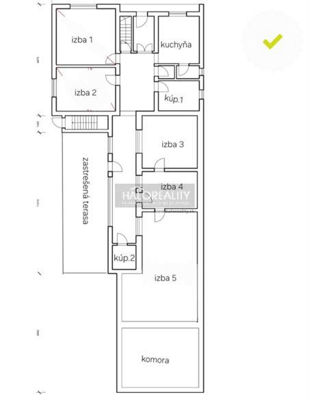 - predsieň, vstupná hala, kuchyňa so špajzou, 5 izieb, 1. kúpeľňa s vaňou a samostatnou toaletou, 2. kúpeľňa so sprchovým kútom a toaletou, bočný vstup cez zastrešenú terasu, vonkajšia komora. Rodinný dom je čiastočne podpivničený.
