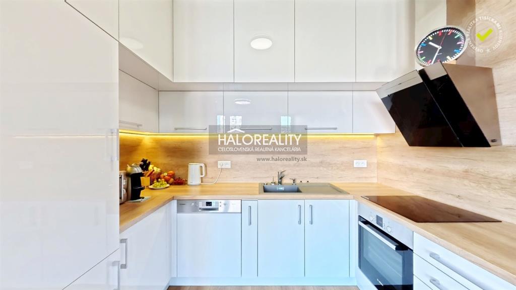 - Kuchyňa je riešená v modernom bielom lesku v kombinácii s drevom, je vybavená vstavanými spotrebičmi a ponúka veľkorysý úložný aj pracovný priestor, vďaka čomu pôsobí prakticky aj vizuálne veľmi čisto.