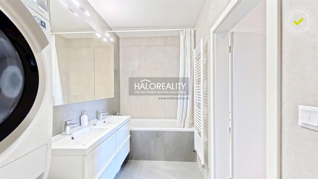 - Kúpeľňa a samostatné WC nesú podpis značiek Hansgrohe, Duravit a Geberit, čo sa odráža na kultivovanom vzhľade aj každodennom komforte; kúpeľňa disponuje vaňou, dvojumývadlom so skrinkou a zrkadlovými skrinkami, zatiaľ čo WC je riešené samostatne mimo kúpeľne.