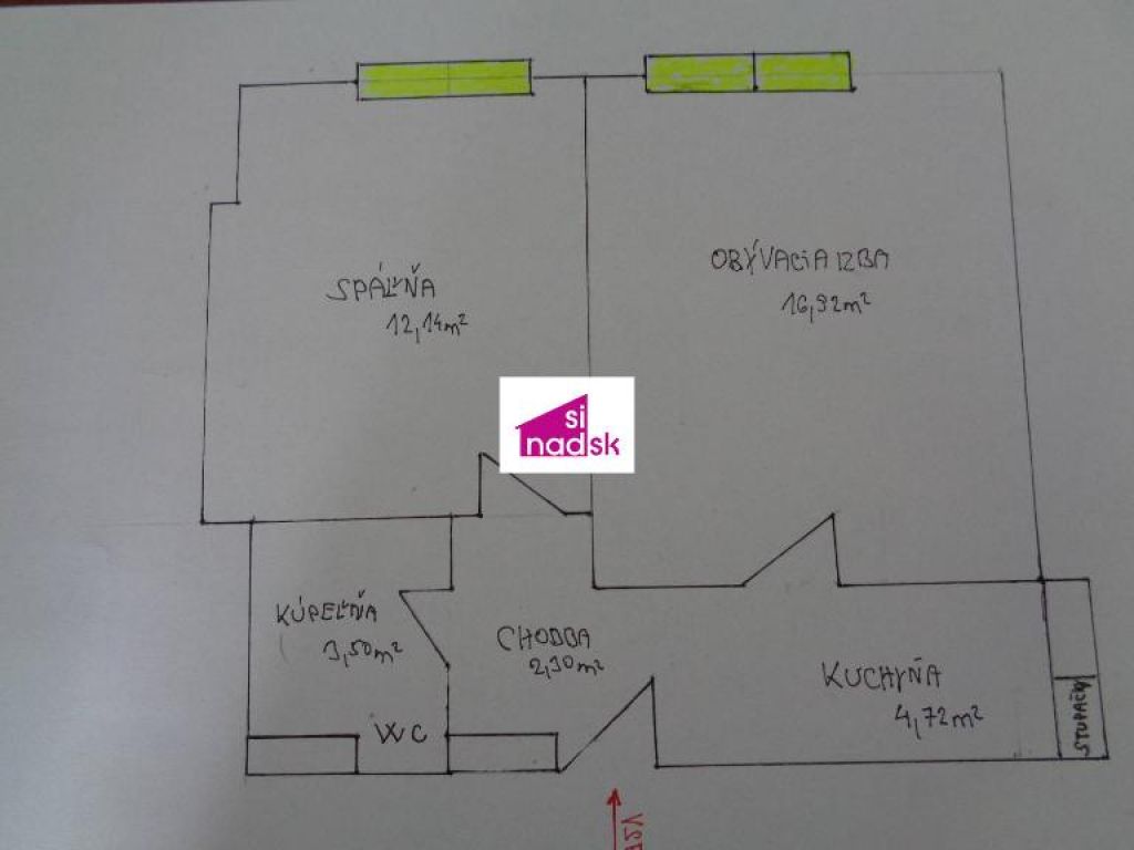Vstupná chodba 2,30m2, 2 x samostatné izby s rozlohou 16,92m2 a druhá izba má rozlohu 12,14m2. Kúpeľňa s vaňou a s WC má rozlohu 3,50m2. Priechodná kuchynka s rozlohou 4,72m2 / kuchynská linka je demontovaná /.