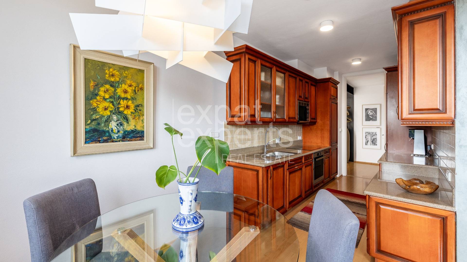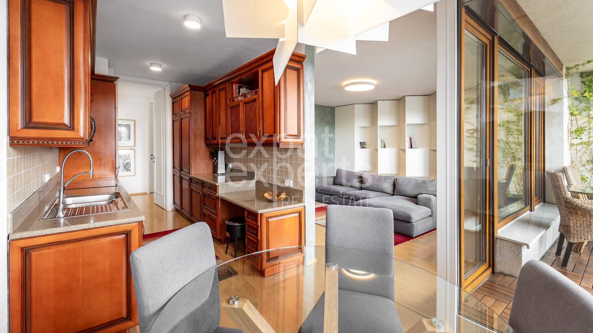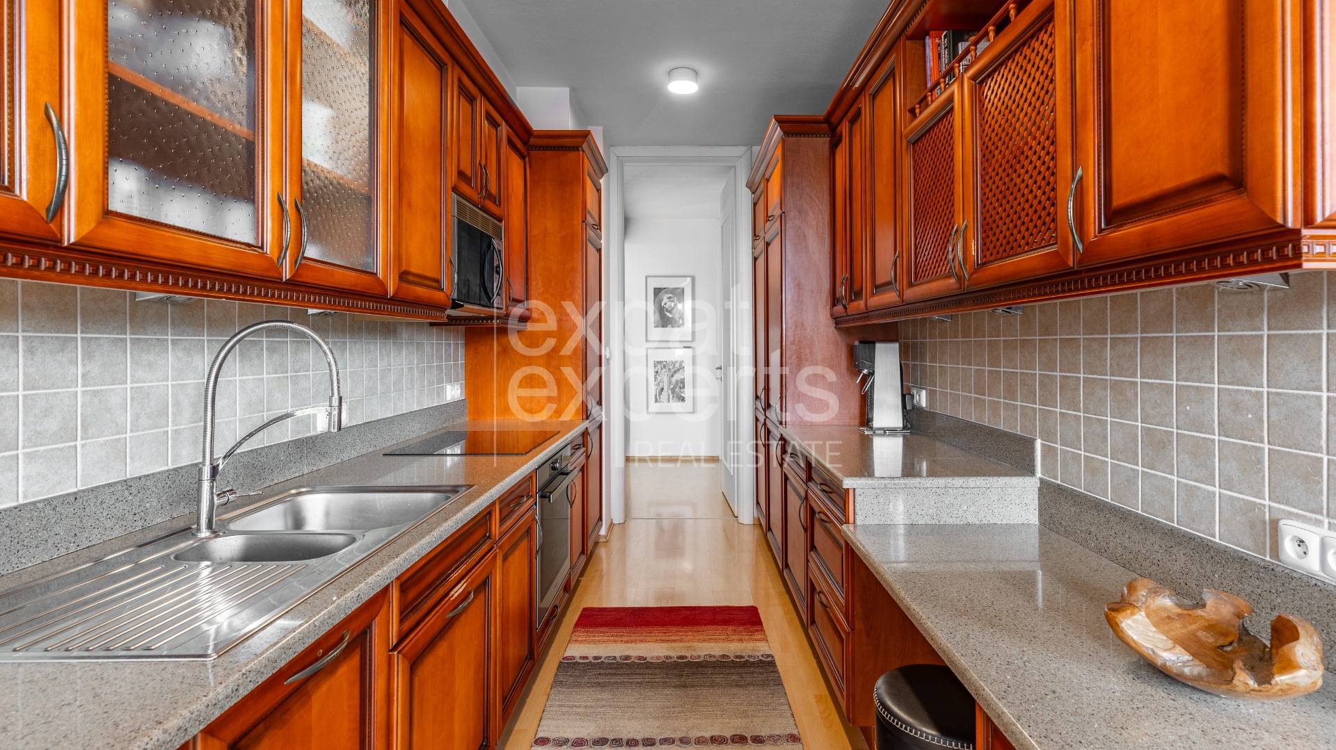 Byt má priestrannú vstupnú halu, z haly je priamy vstup do obývacej izby, s loggiou (9,5 m2), kuchyňou s jedálenskou časťou, detská izba, hosťovská izba, hlavná spálňa s kúpeľňou, samostatná kúpeľňa, samostatná toaleta Veľkorysá kuchynská linka s množstvom odkladacieho priestoru je vybavená spotrebičmi (zabudovaná varná doska, digestor, vstavaná elektrická rúra, umývačka riadu, samostatná vysoká chladnička, samostatná vysoká mraznička).