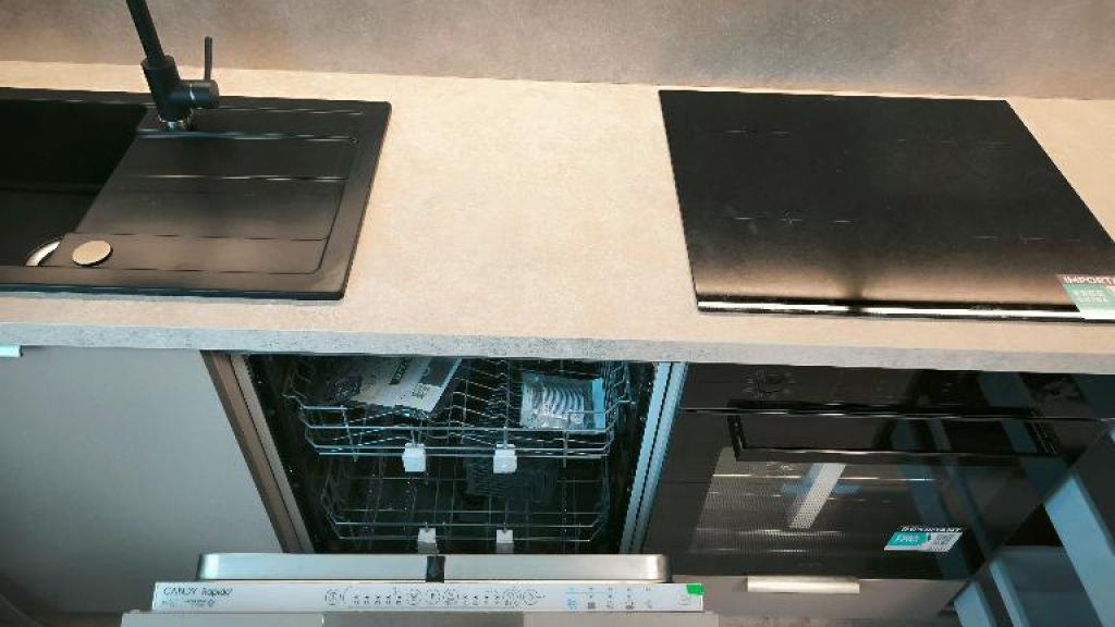 KUCHYŇA: nová moderná na mieru robená kvalitná kuchynská linka zn.DECODOM v trendovej farbe kašmír svetlý i tmavý odtieň vrátane všetkých zabudovateľných všetkých spotrebičov zn. CONCEPT /zabudovateľná umývačka riadu, digestor, sklo-keramická varná indukčná doska, teplovzdušná rúra a vysoká chladnička s mrazničkou/.