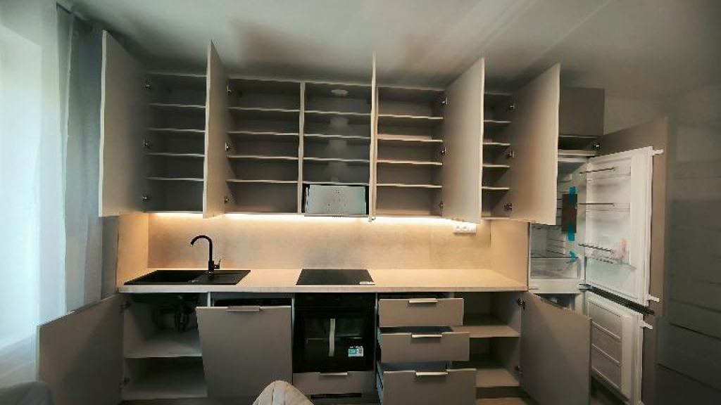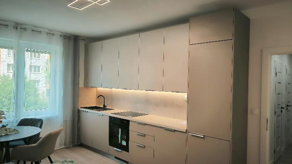 V CENE BYTU je úplne nové moderné zariadenie na mieru - kvalitný nábytok vo farbe kašmír s kombináciou dreva a v identickej farbe s podlahou.