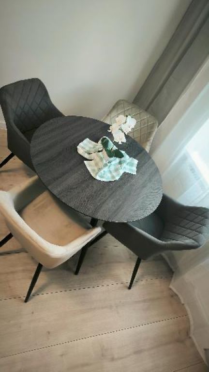 OBÝVAČKA: moderná sedačka v trendovej šedej farbe, komoda , stolík, nový jedálenský okrúhly drevený stôl a nové 4 moderné stoličky,